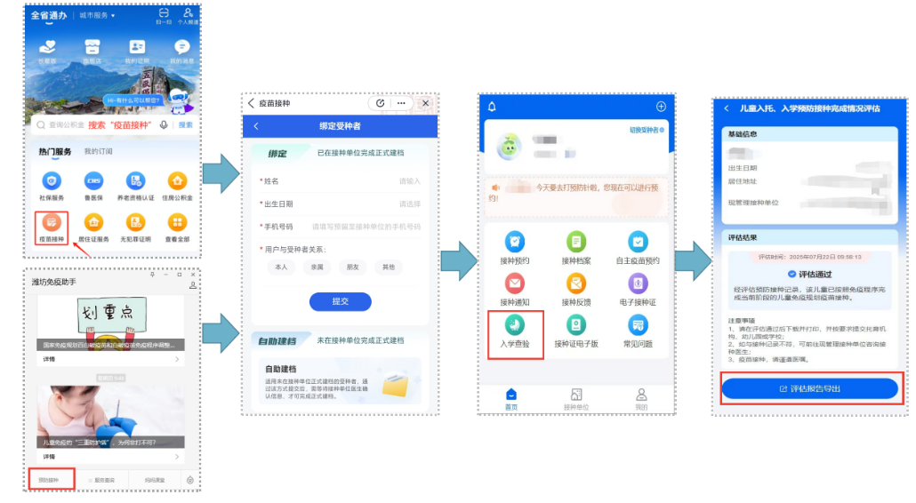 ①评估结果为“评估通过”,可点击下方“评估报告导出”,预览并确认《国家免疫规划疫苗预防接种查验单》信息无误;直接下载、打印电子版。