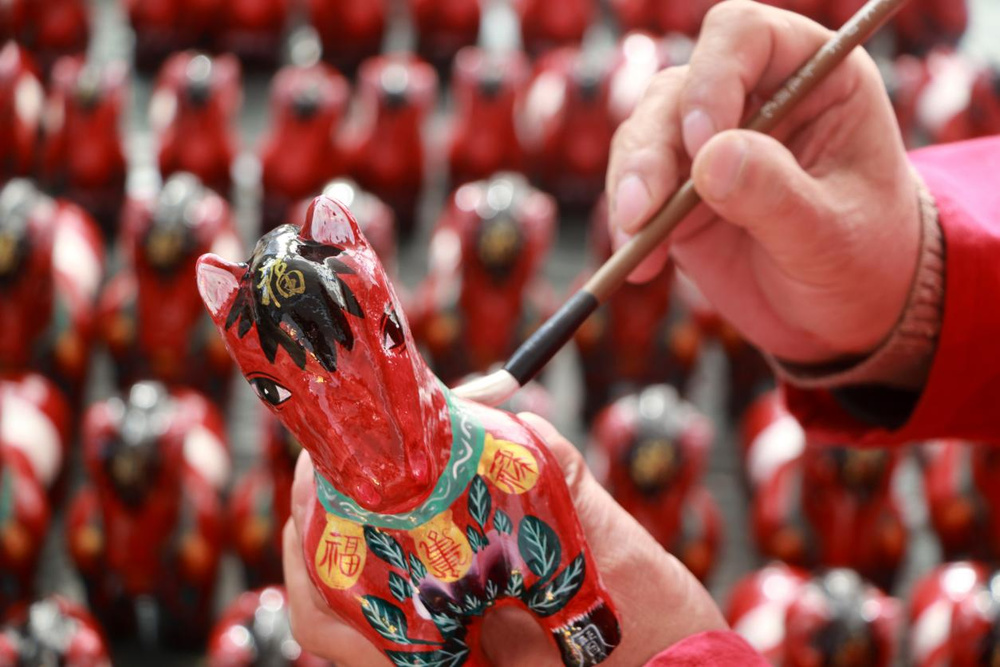 为迎接农历新年,潍坊高密姜庄镇聂家庄泥塑艺人忙着创作生肖马主题泥塑作品,供应年货市场。