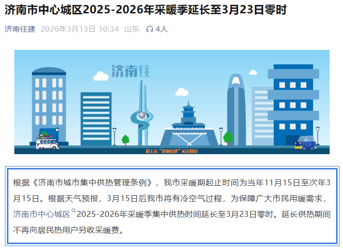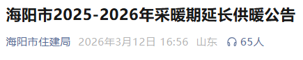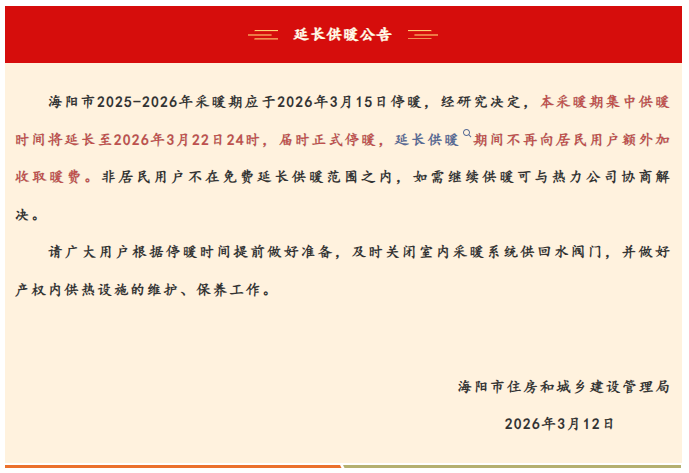 海阳市2025-2026年采暖期应于2026年3月15日停暖,经研究决定,本采暖期集中供暖时间将延长至2026年3月22日24时,届时正式停暖,延长供暖期间不再向居民用户额外加收取暖费。非居民用户不在免费延长供暖范围之内,如需继续供暖可与热力公司协商解决。