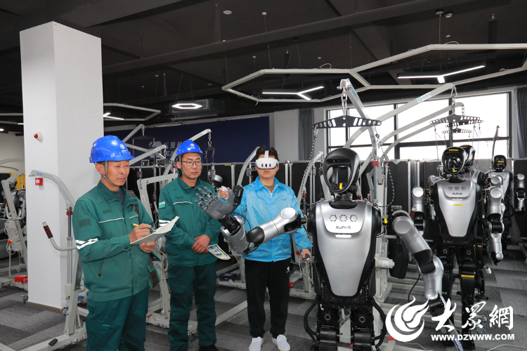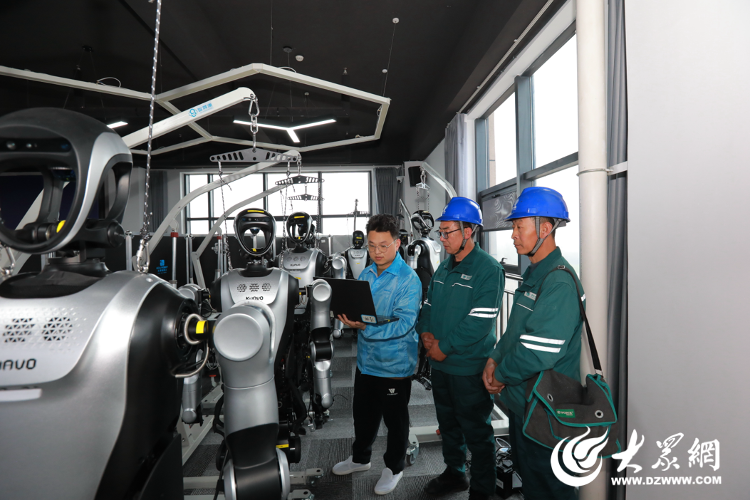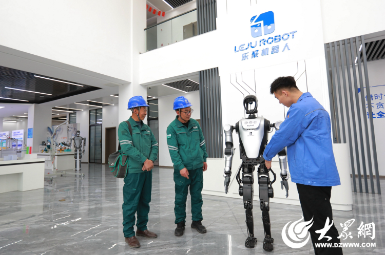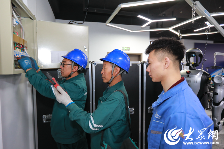 在乐聚(山东)机器人科技有限公司展示区,一台会说话的人形机器人见到正在服务的供电员工说,“为国家电网点赞!”。这里不仅有会说话的人形机器人,还有会武术表演的迷你型机器人,一套组合拳下来,让前来洽谈业务的客户赞叹不已。“供电员工对我们的充电电源检测得非常仔细认真,每台机器人的电池续航都很充足。”这家企业机器人开发项目负责人王光森介绍。