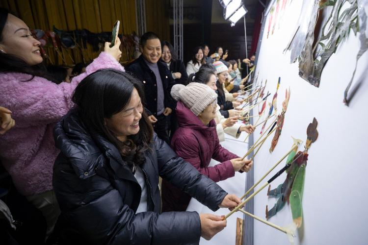 在位于阆中市的四川王皮影艺术博物馆,年轻观众受邀上台体验表演皮影戏《迪斯科》(2月19日摄)。
