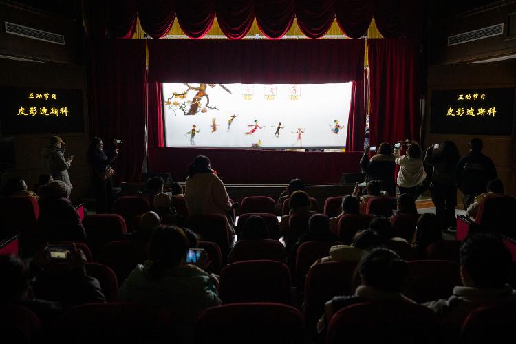 在位于阆中市的四川王皮影艺术博物馆,观众在观看皮影戏剧目《迪斯科》(2月18日摄)。