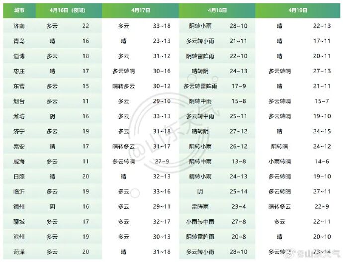 19日白天到夜间,烟台和威海天气阴局部有雷雨或阵雨转多云,其他地区天气多云转晴。北风转南风3~4级,雷雨地区雷雨时阵风7~9级。夜间最低气温:半岛地区7℃左右,济宁和枣庄12℃左右,其他地区10℃左右。最高气温:沿海地区17℃左右,泰安和临沂26℃左右,其他地区22℃左右。