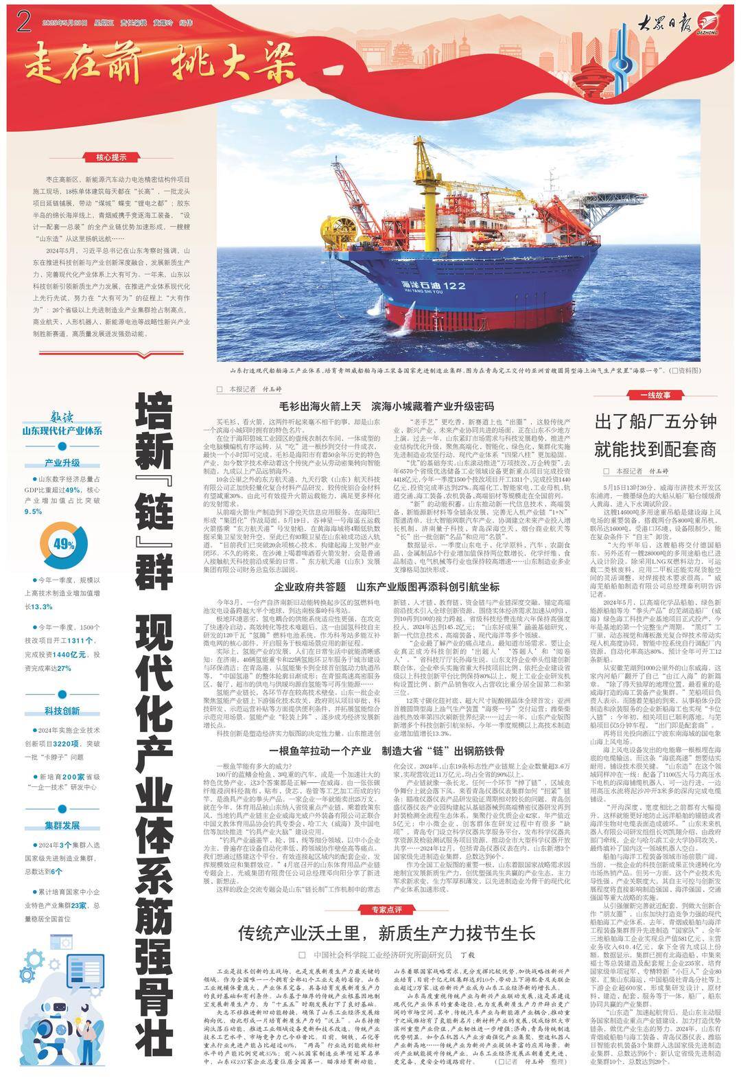 枣庄高新区,新能源汽车动力电池精密结构件项目施工现场,18栋单体建筑每天都在“长高”,一批龙头项目延链铺展,带动“煤城”蝶变“锂电之都”;胶东半岛的绵长海岸线上,青烟威携手竞逐海工装备,“设计—配套—总装”的全产业链优势加速形成,一艘艘“山东造”从这里扬帆远航……
