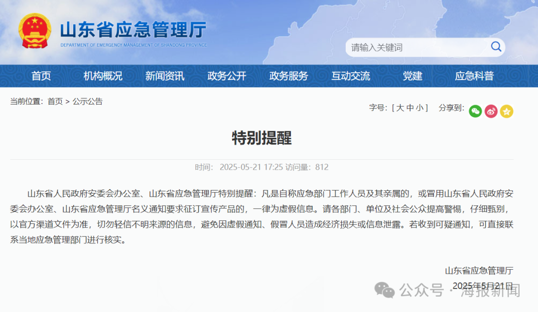 山东省人民政府安委会办公室、山东省应急管理厅特别提醒:凡是自称应急部门工作人员及其亲属的,或冒用山东省人民政府安委会办公室、山东省应急管理厅名义通知要求征订宣传产品的,一律为虚假信息。请各部门、单位及社会公众提高警惕,仔细甄别,以官方渠道文件为准,切勿轻信不明来源的信息,避免因虚假通知、假冒人员造成经济损失或信息泄露。若收到可疑通知,可直接联系当地应急管理部门进行核实。