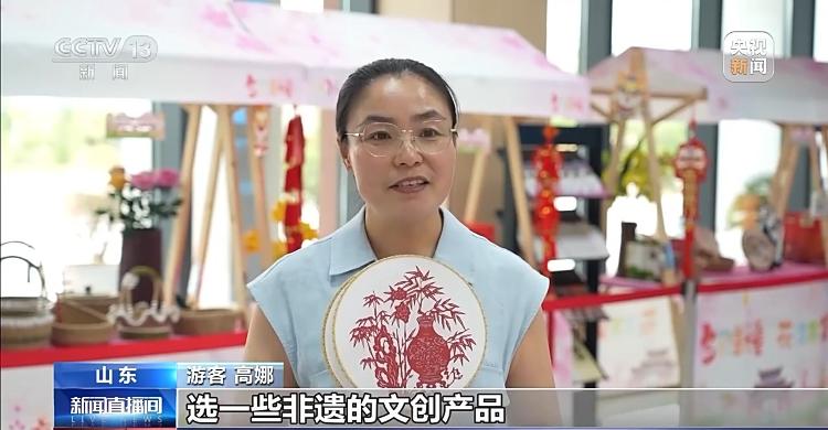 游客 高娜:经常跟朋友们来这里逛一逛,选一些非遗的文创产品,今天选了几把这个剪纸的折扇,特别喜欢。