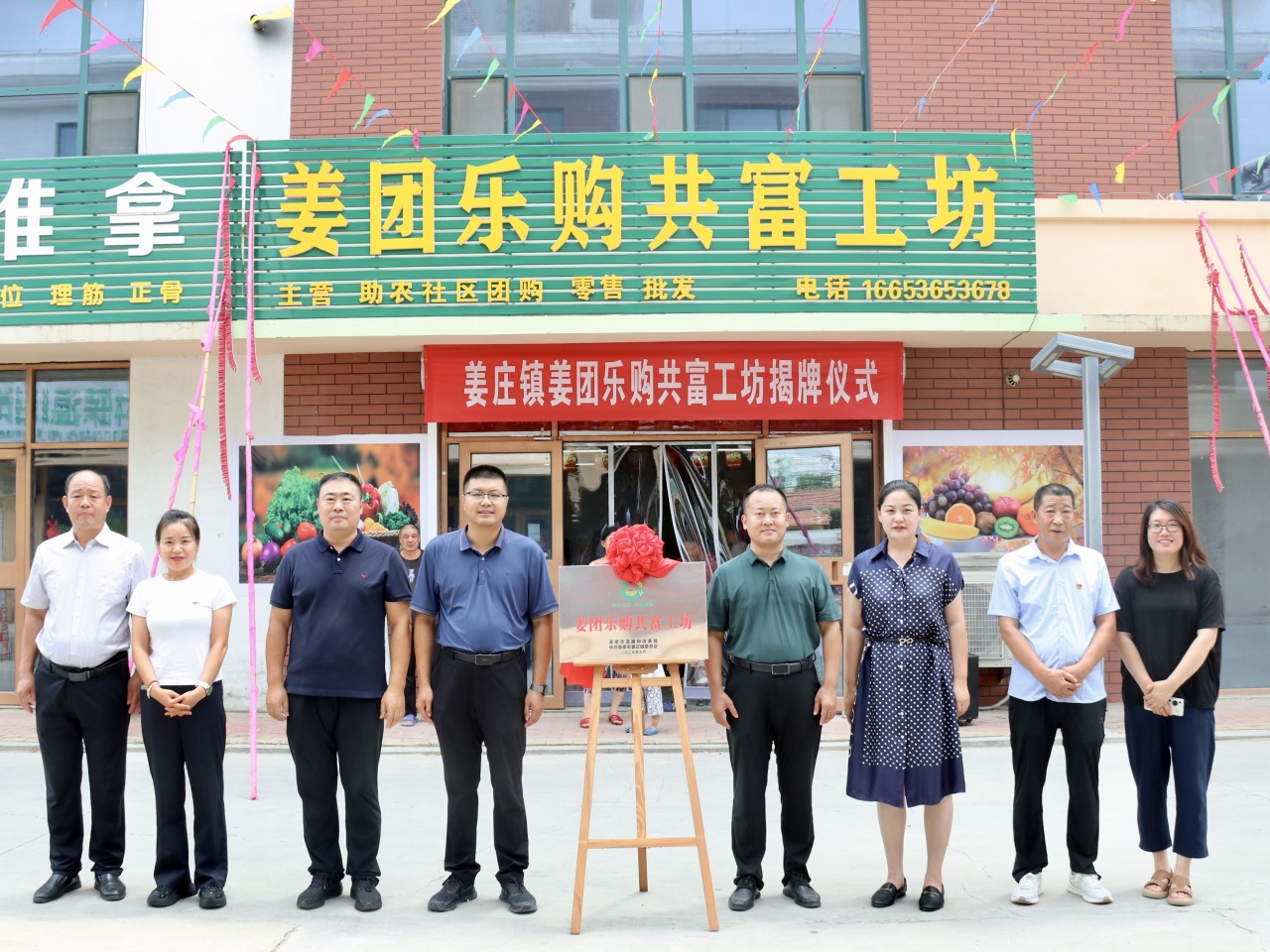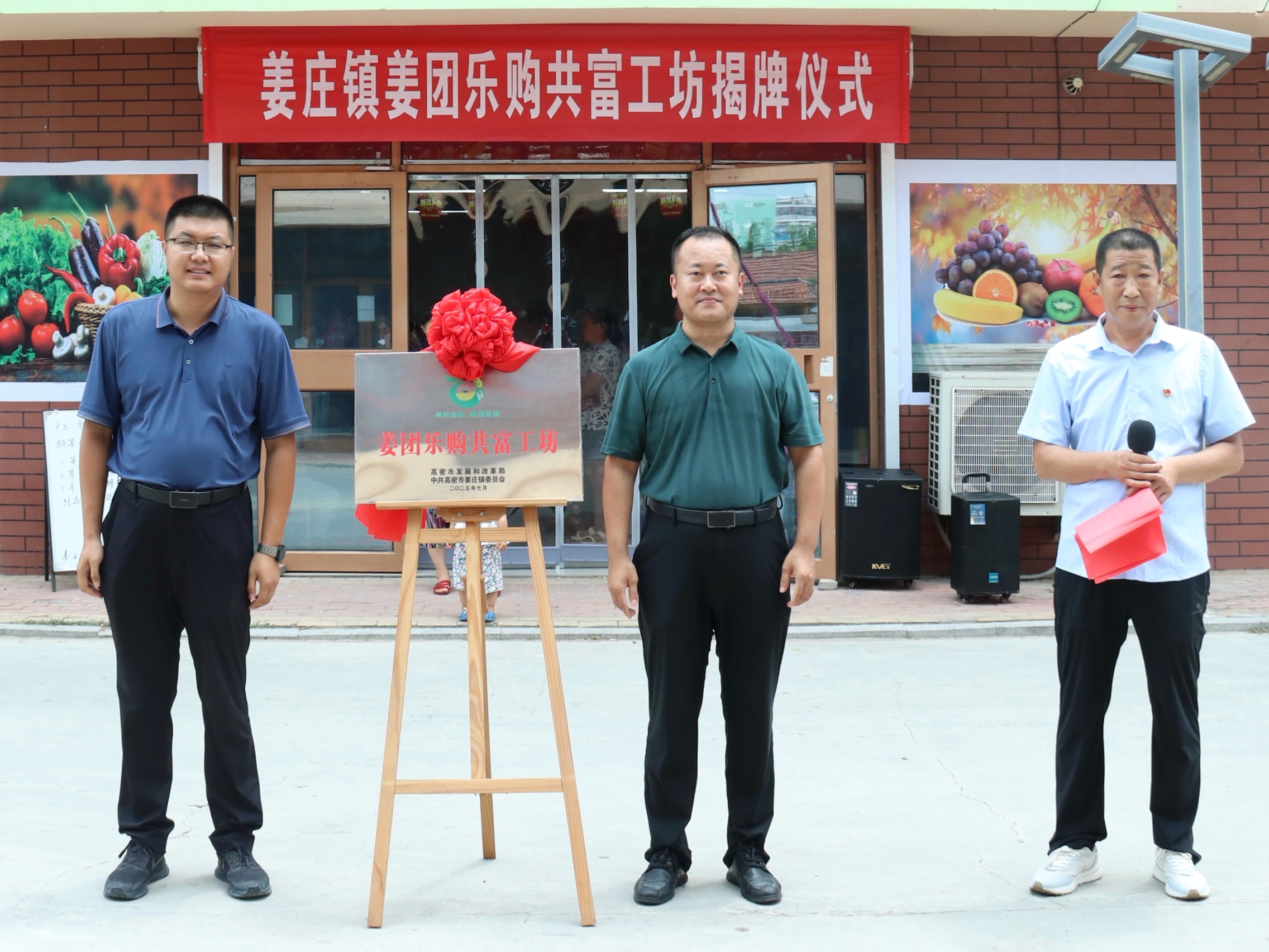 市委组织部副部长唐召康和姜庄镇党委副书记、镇长曾繁昌共同为“姜团乐购共富工坊”揭牌。