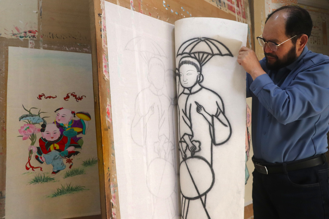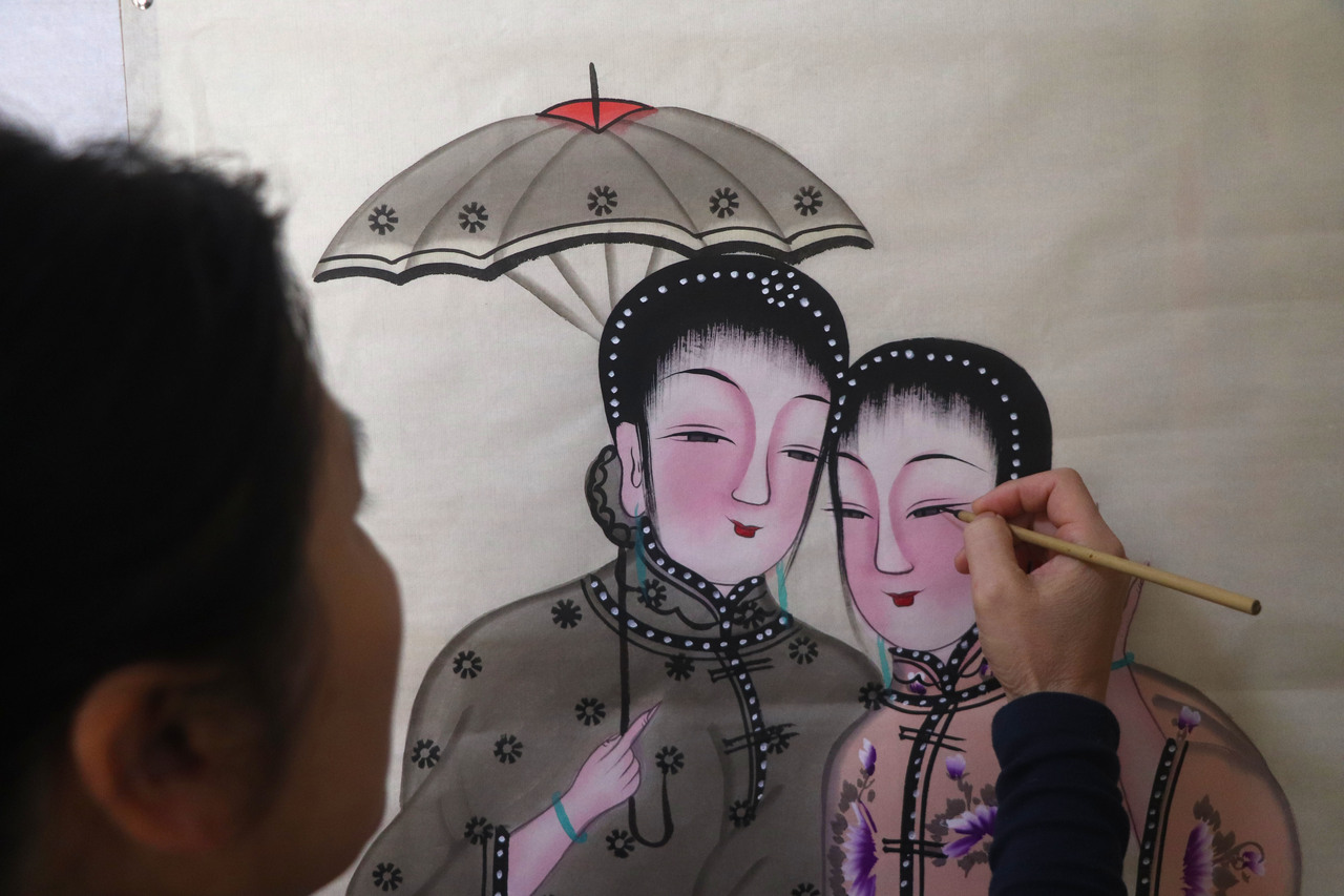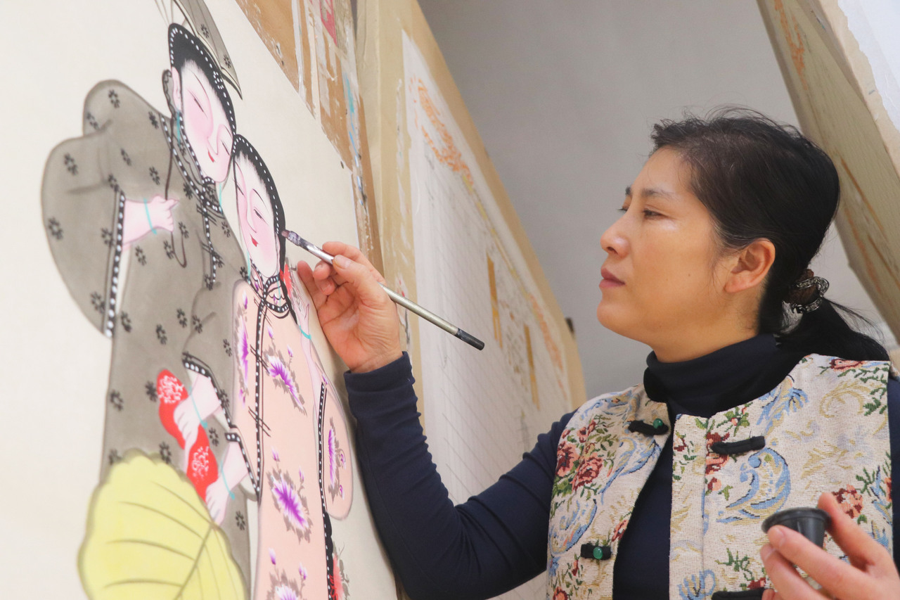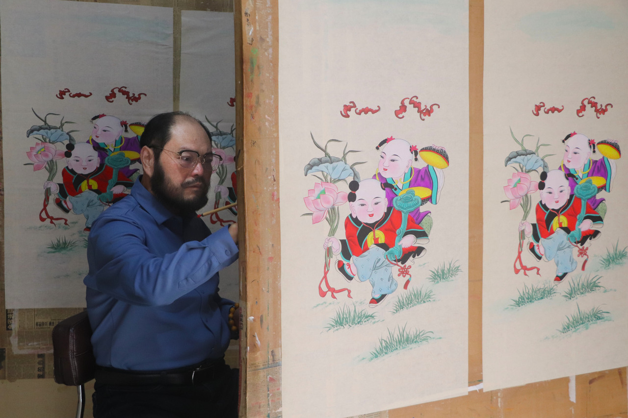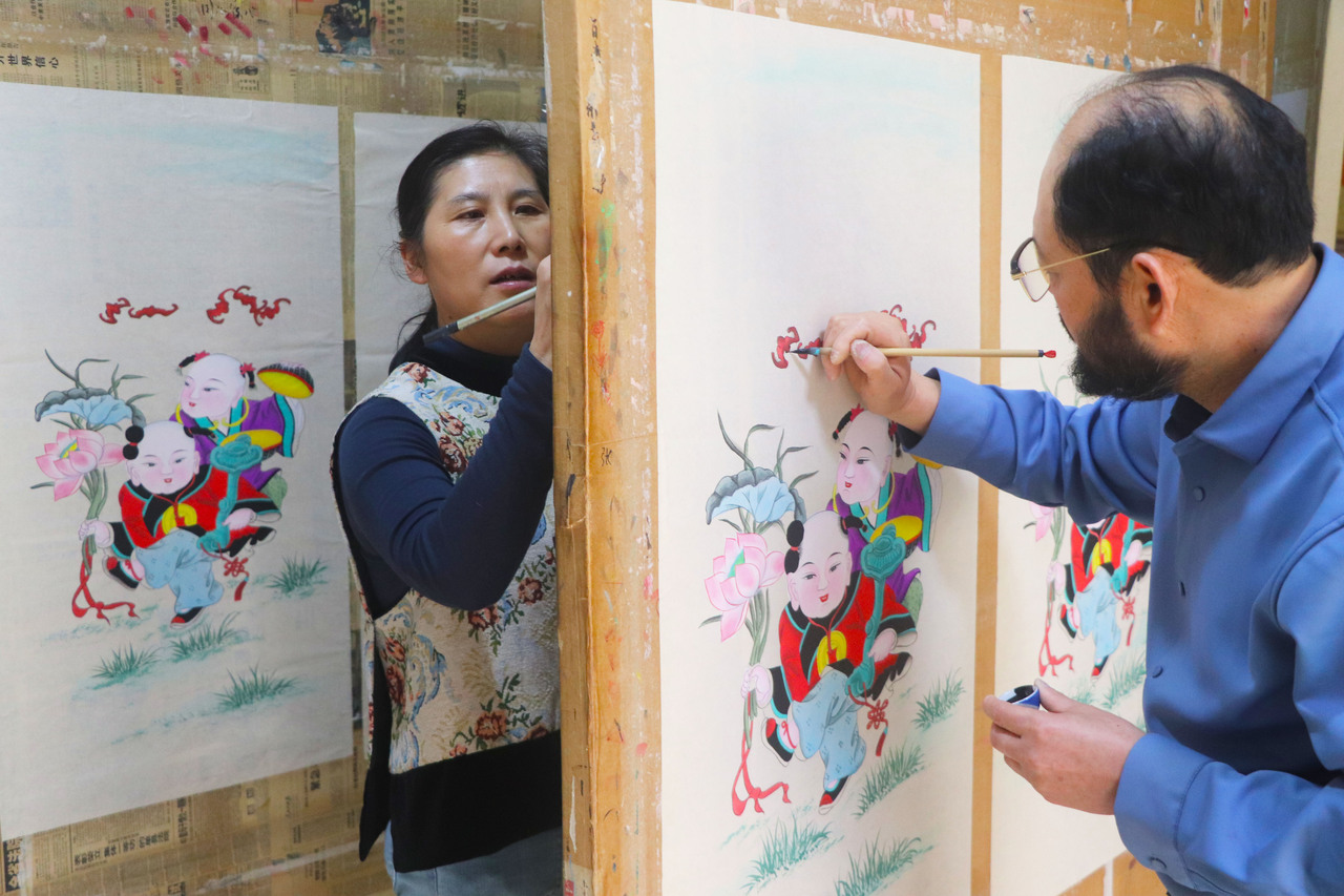 11月16日,在山东省高密市姜庄镇,民间艺人在赶制客户订购的扑灰年画。