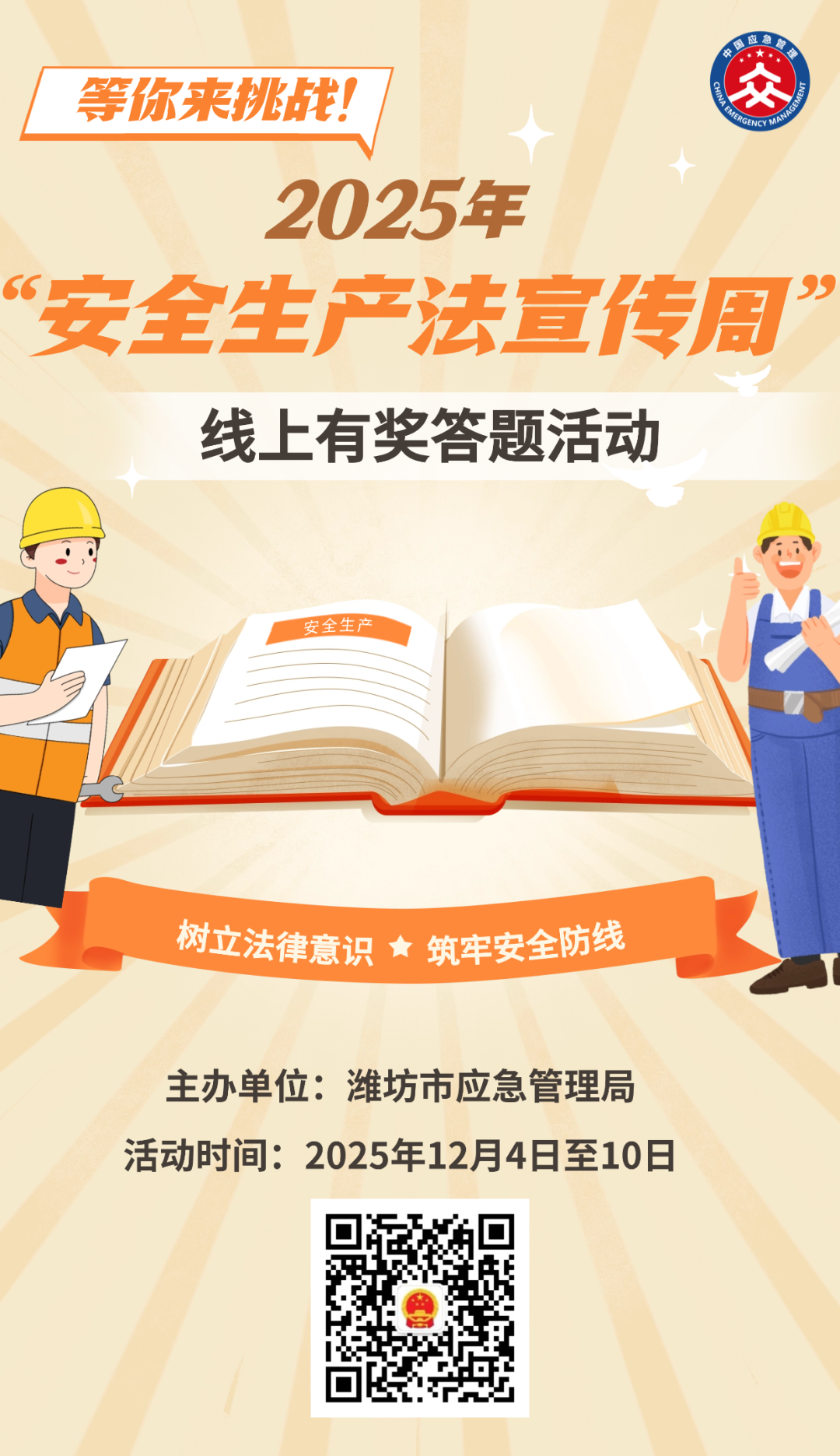 今年12月第一周为第九个安全生产法宣传周,为树牢安全理念,普及安全生产法律法规,增强安全生产意识,市应急局开展2025年“安全生产法宣传周”线上答题活动,通过线上答题方式,普及安全知识,营造尊法、学法、守法、用法的浓厚氛围。