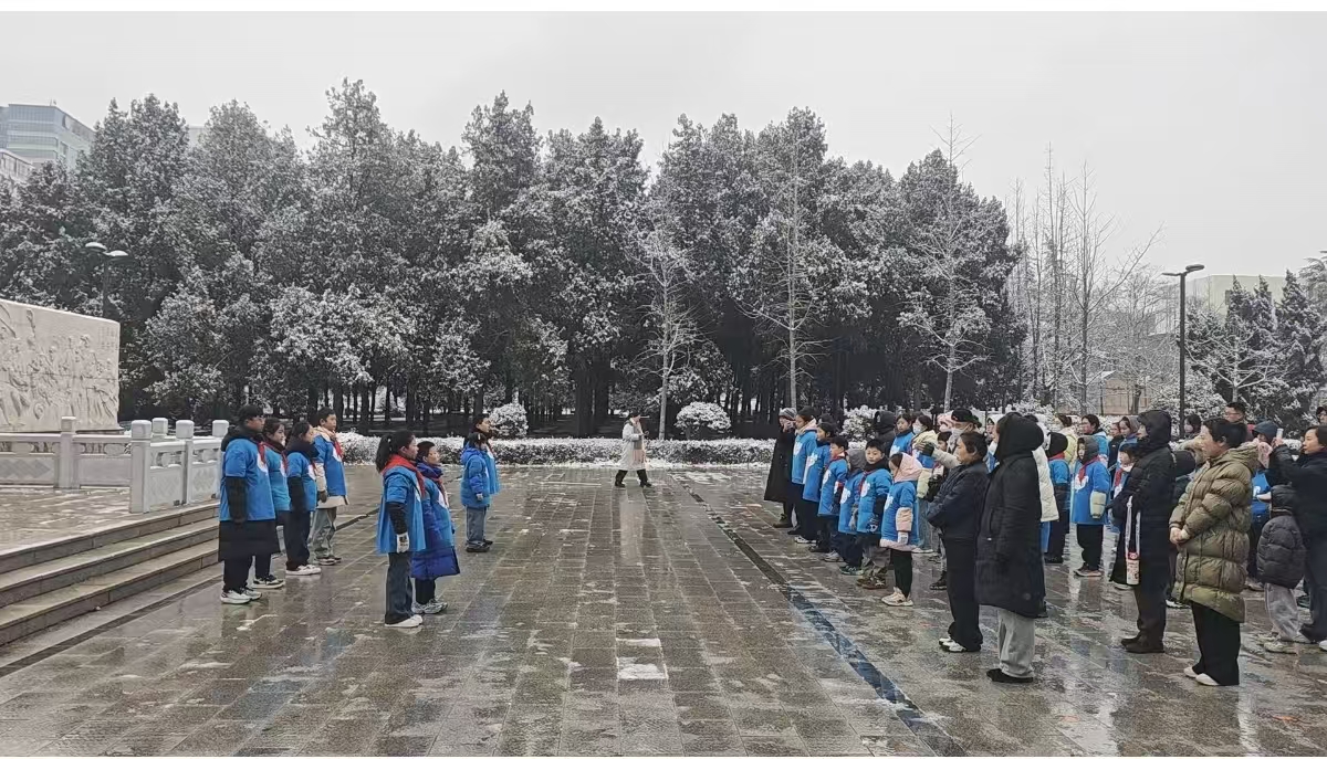2025年12月13日,第12个南京大屠杀死难者国家公祭日,恰逄高密的第一场大雪,烈士陵园翠柏远看似洁白的花环,市青少年志愿者组织来到烈士陵园开展了“铭记国殇·振兴中华”主题教育活动,40组爱心家庭和烈士陵园志愿工作人员80余人参加。