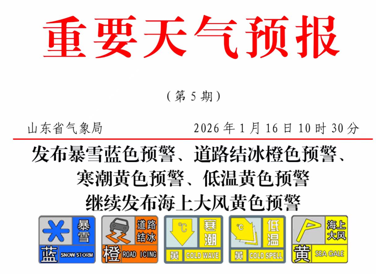 山东省气象台于1月16日10时30分发布暴雪蓝色预警、道路结冰橙色预警、寒潮黄色预警、低温黄色预警,继续发布海上大风黄色预警:受强冷空气和暖湿气流共同影响,预计17日夜间至19日夜间我省将出现寒潮、雨雪冰冻和大风降温天气。20—25日有低于-12℃的持续低温。
