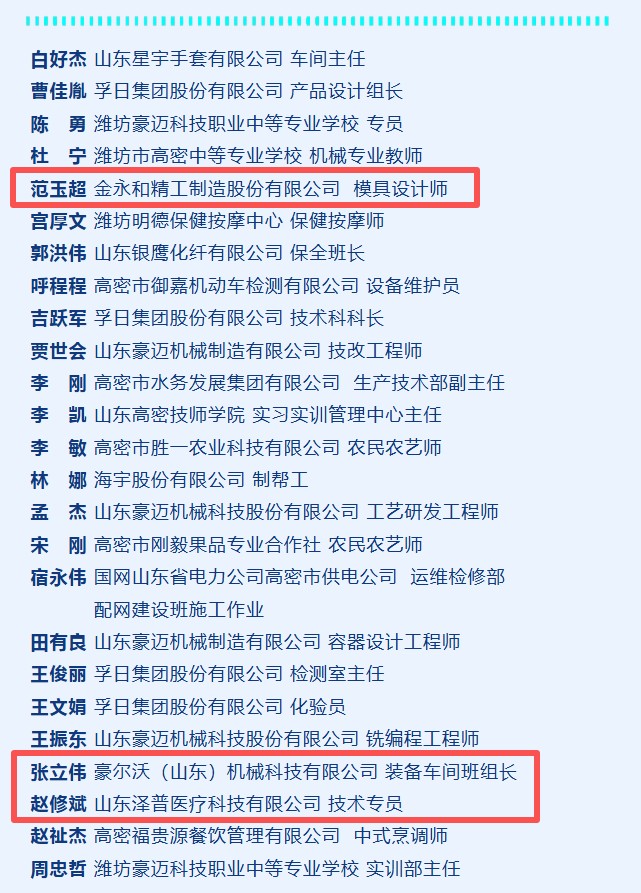 根据《关于重点培育2025年度“高密工匠”的通知》精神,经组织推荐、初审筛选、专家评议、实地考察等程序,产生了2025年度“高密工匠”“高密手造工匠”培育对象名单。夏庄镇金永和精工制造股份有限公司模具设计师范玉超、豪尔沃(山东)机械科技有限公司装备车间班组长张立伟、山东泽普医疗科技有限公司技术专员赵修斌3人成功入选。