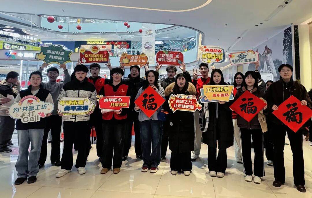 在团市委的组织号召下,高密市“工坊有好礼 骏马踏春集”年货节现场,“青鸟计划”社会实践大学生化身“青春体验官”,他们手持精心设计的创意标语牌——“奋斗的青春,最美的风景”“青鸟归乡,聚力共富”“青年之力,让年味更潮”,迅速成为现场最亮眼的“移动风景线”。