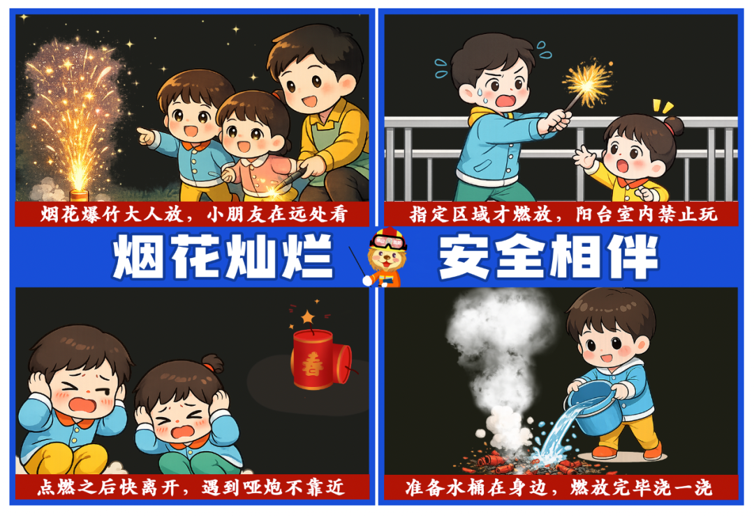 • 监护到位:未成年人燃放烟花爆竹时,需由成年人全程陪同操作,儿童应在安全距离外观看,避免被火星烫伤或爆竹炸伤。