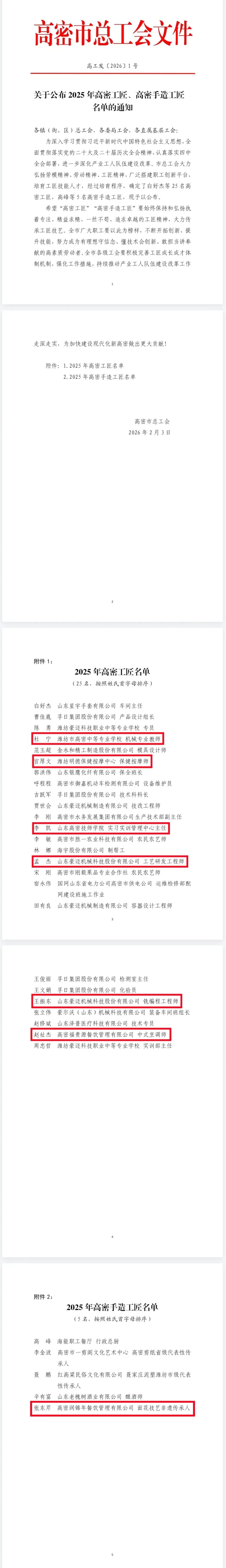 ▲2月3日,高密市总工会公布2025年高密工匠、高密手造工匠名单,密水街道杜宁等7人上榜。