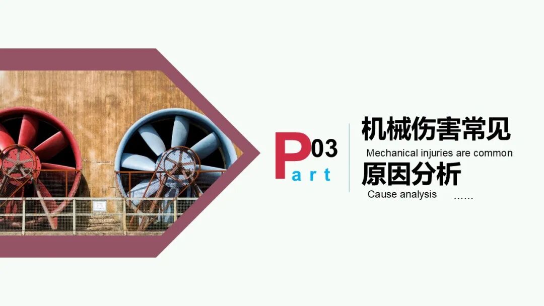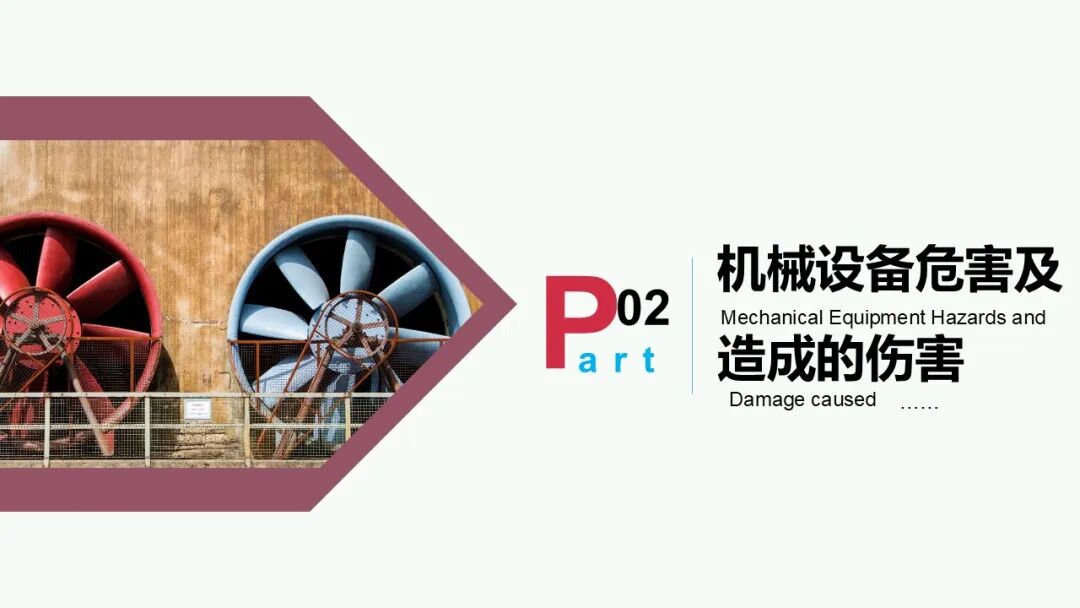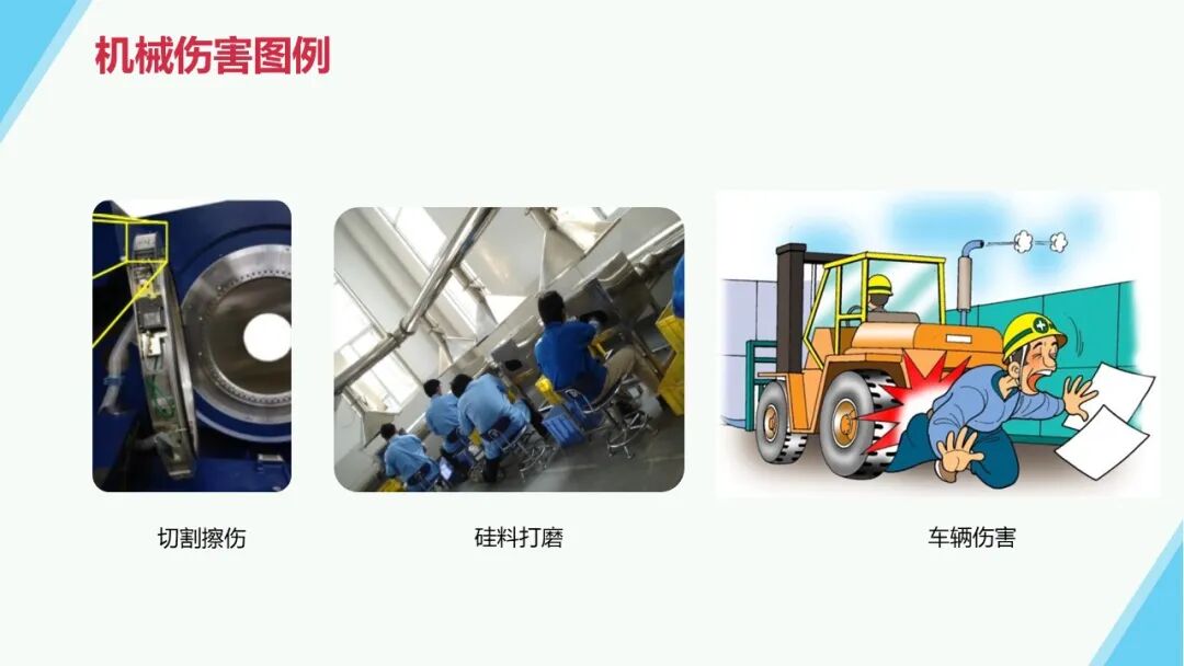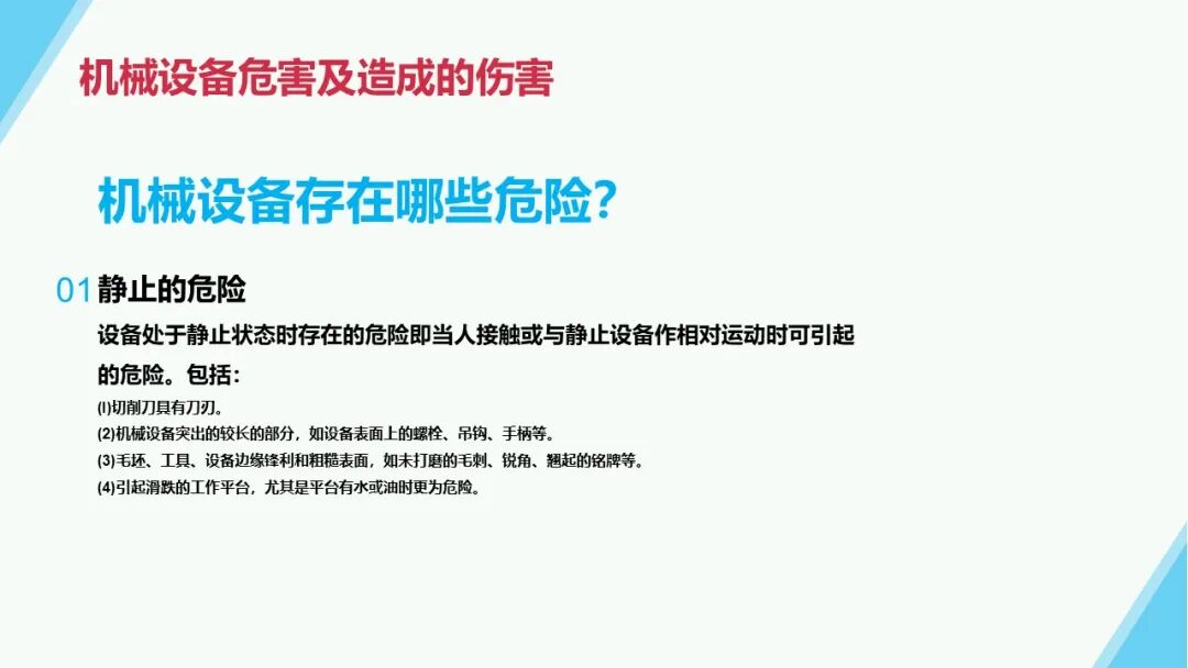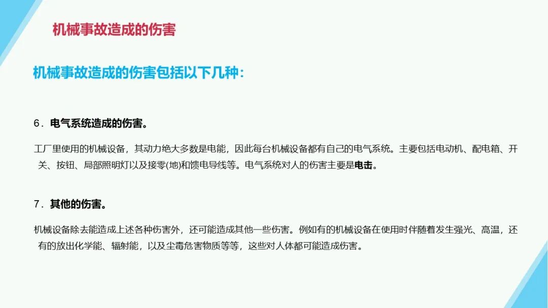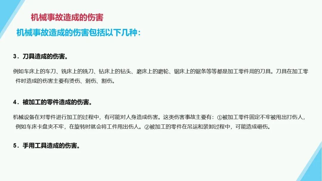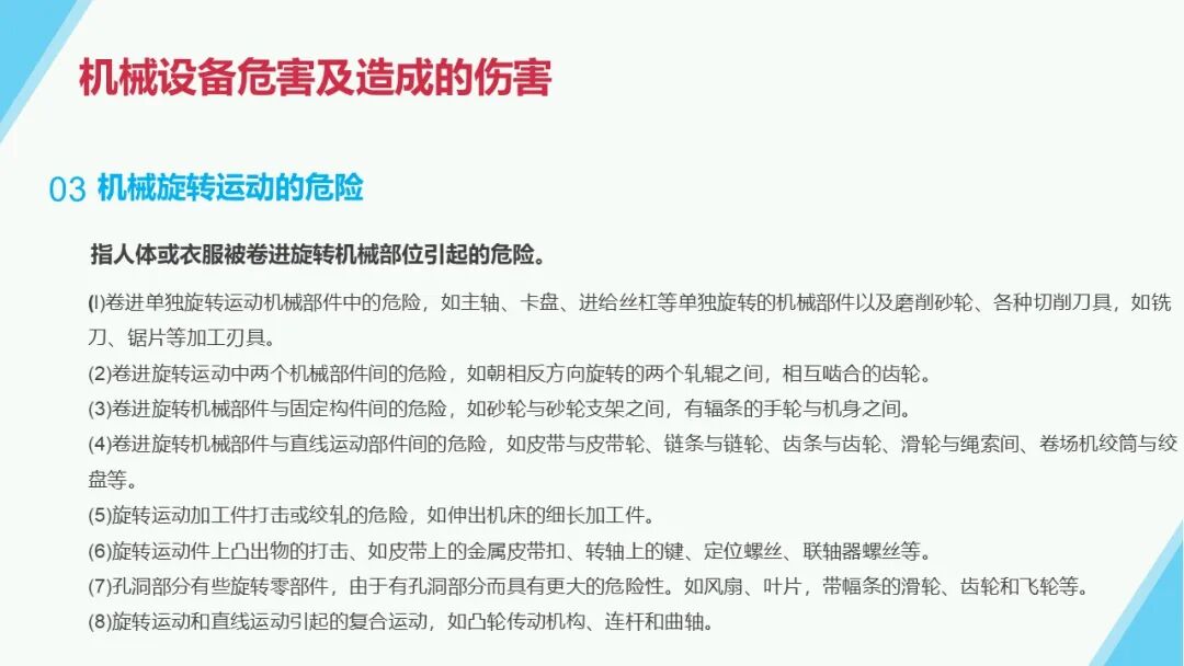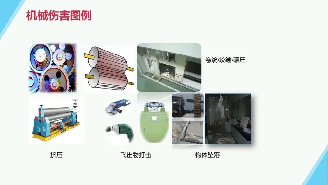 (1)机械设备防护设施不全、传动部位无防护罩、转动轴无防护罩等造成的绞、碾、碰、割、戳、切等伤害。