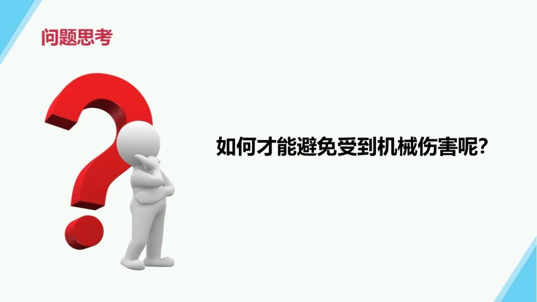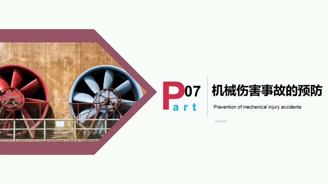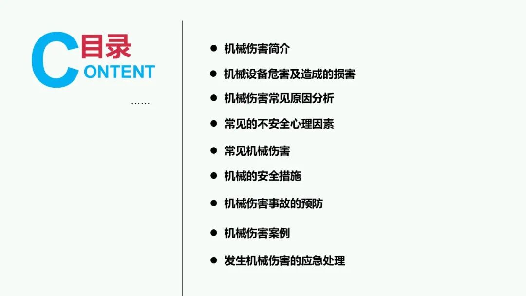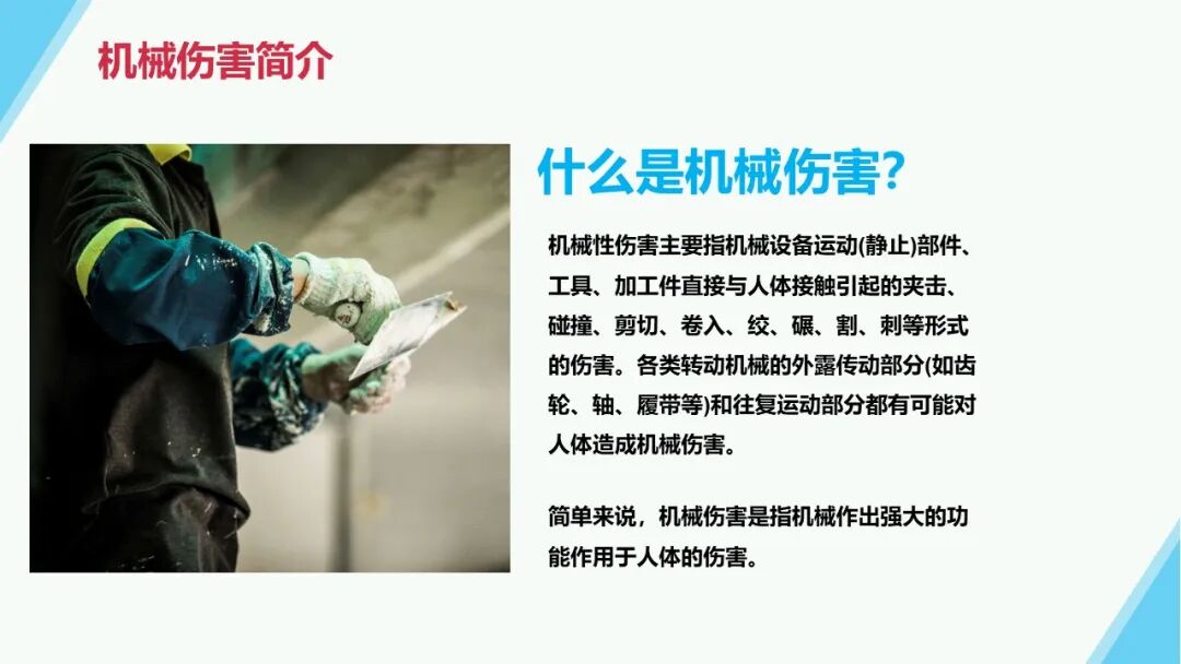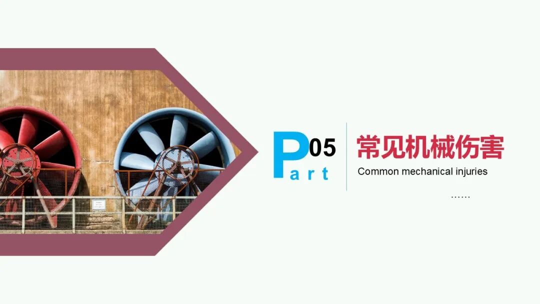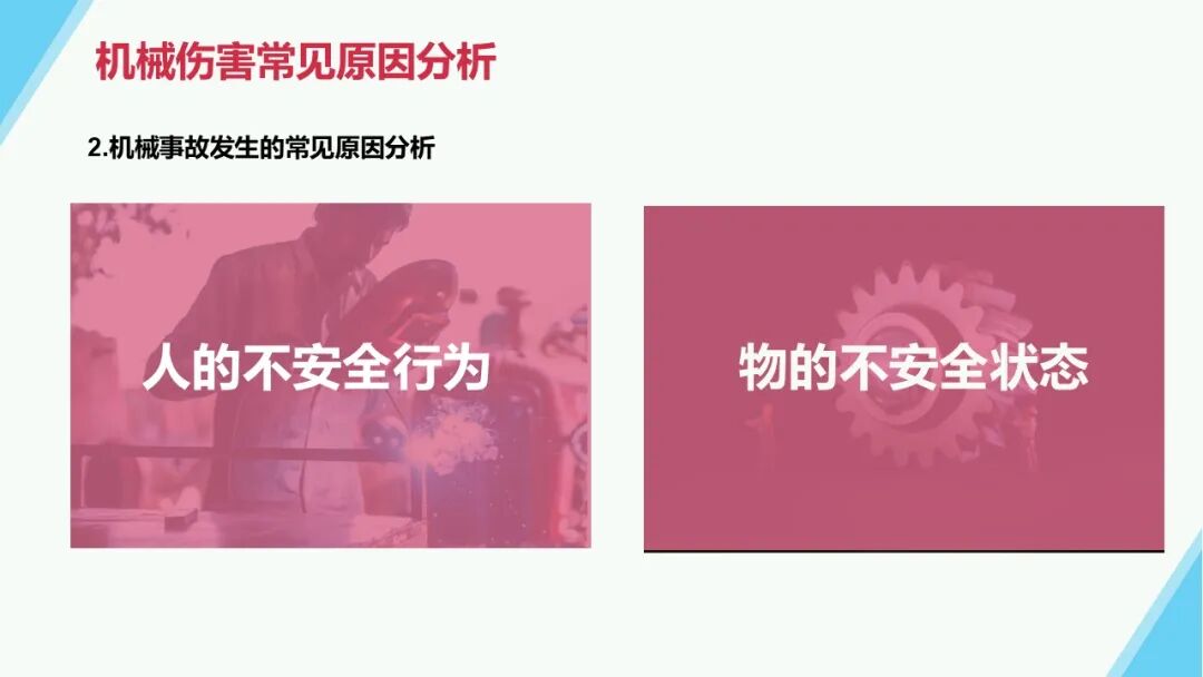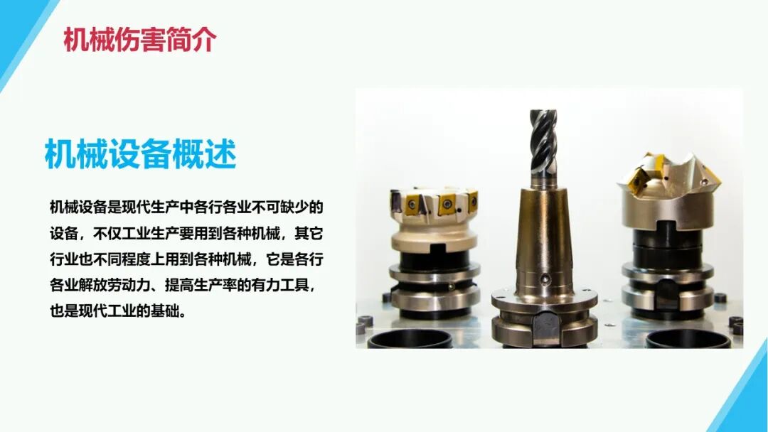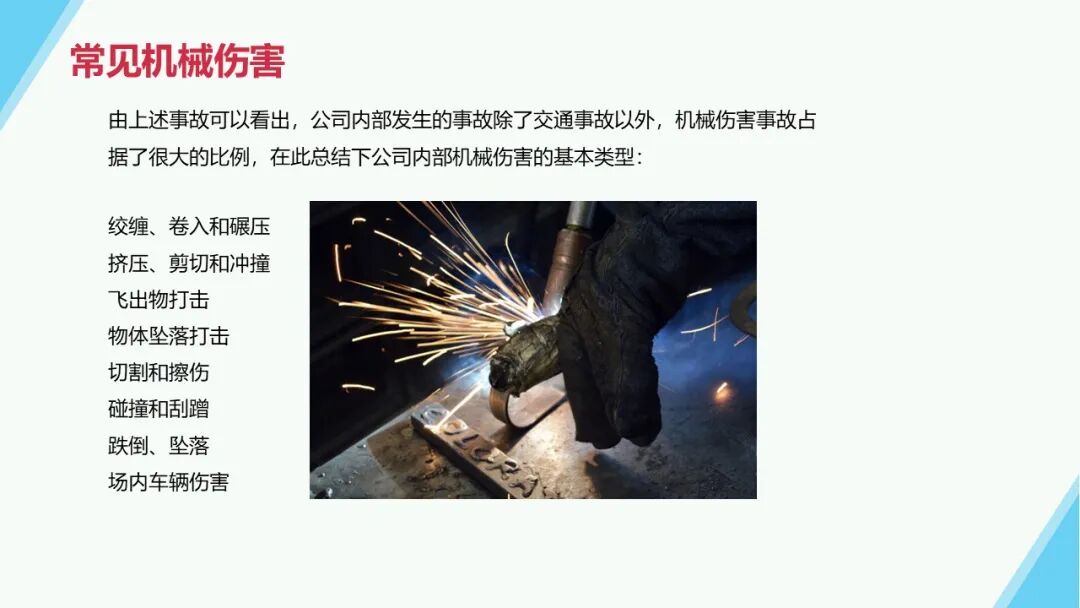 (1)机械设备防护设施不全、传动部位无防护罩、转动轴无防护罩等造成的绞、碾、碰、割、戳、切等伤害。