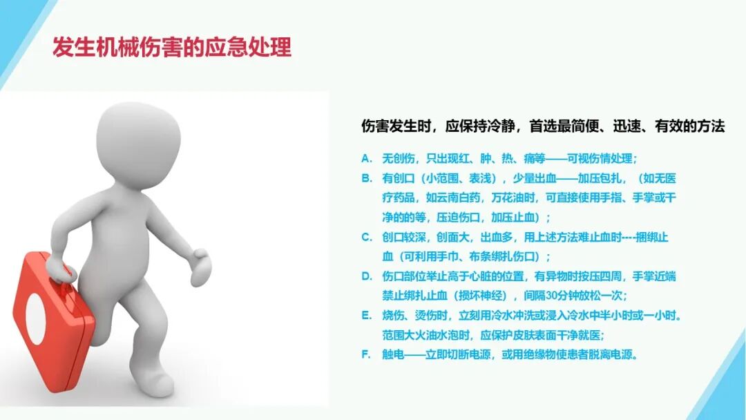 (7)受伤人员出现呼吸、心跳停止症状后,必须立即进行心脏按压或人工呼吸。AED(体外除颤仪)一旦到达现场应立即使用,具体操作方式根据工厂购买的型号进行。