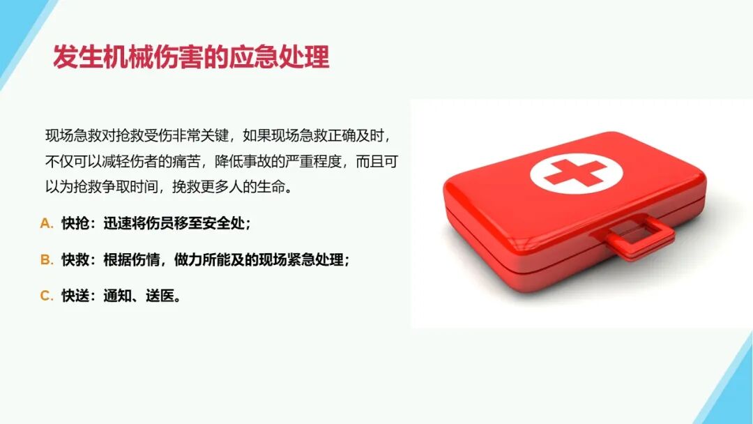 ②立即按现场应急处置措施实行,如切断电源,按下急停按键,使受害者脱离设备等。