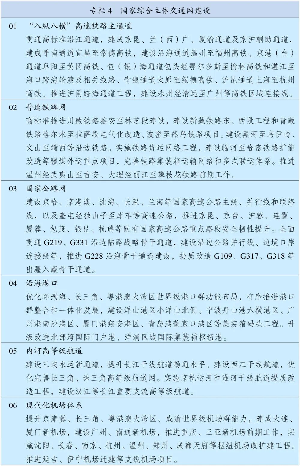 完善国家综合立体交通网主骨架,高质量建设沿海沿边沿江、出疆入藏、西部陆海新通道等战略骨干通道,基本建成“八纵八横”高速铁路主通道和国家高速公路网,推进内河高等级航道提质升级,基本建成世界级港口群和机场群。