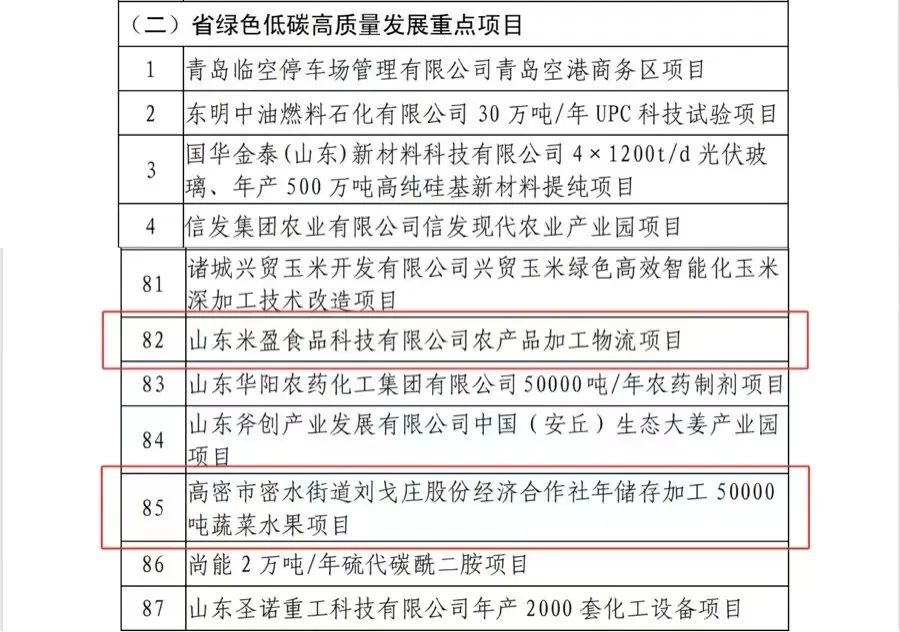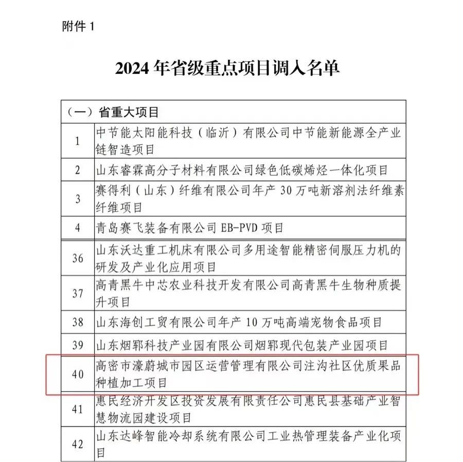 8月6日,山东省发展和改革委员会下发《关于印发2024年省级重点项目调整名单的通知》,我市共增补3个省级重点项目,其中:省重大项目1个—高密市濠蔚城市园区运营管理有限公司注沟社区优质果品种植加工项目;省绿色低碳高质量发展项目2个—高密市密水街道刘戈庄股份经济合作社年储存加工50000吨蔬菜水果项目、山东米盈食品科技有限公司农产品加工物流项目。截止目前,我市2024年省级重点项目共15个,数量居潍坊市第二位。