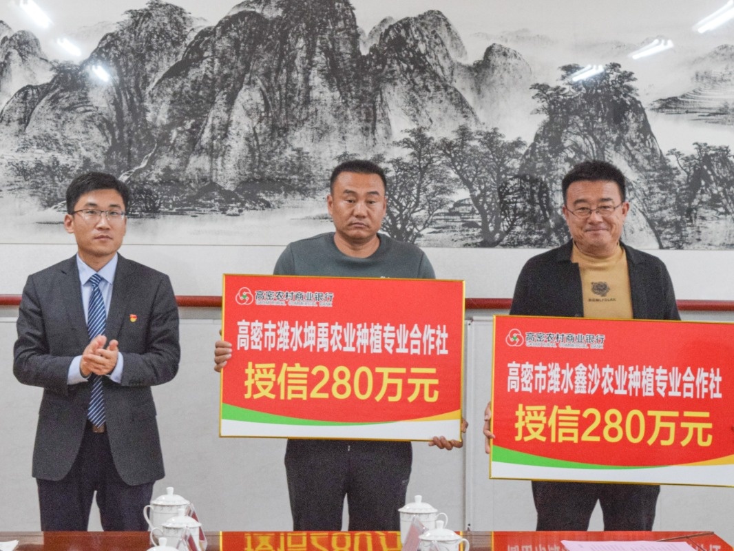 ▲马兴涛行长为高密市潍水鑫沙农业种植合作社、潍水坤禹农业种植专业合作社颁发授信牌