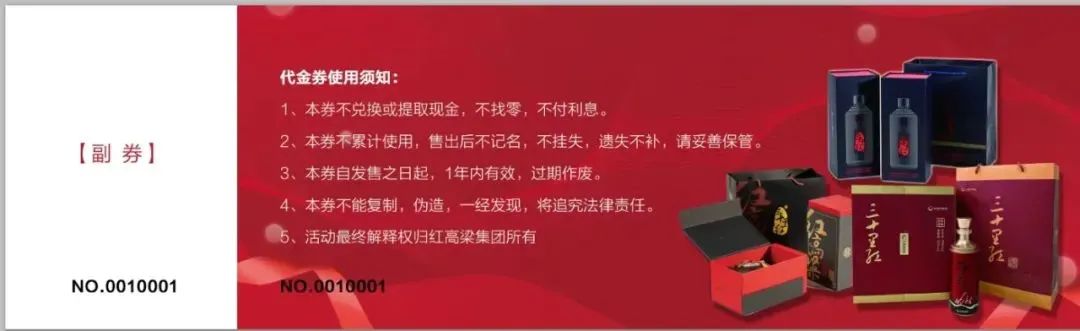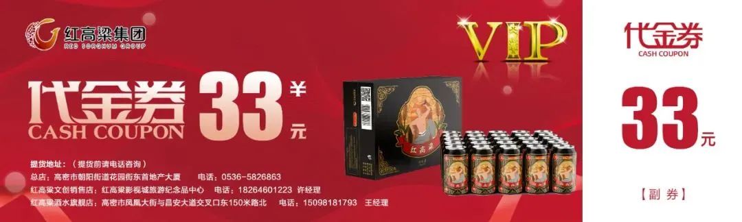 2.酒水代金券可就近到以下两个地点领取:(1)昌安大道与创业街交叉口东200米路南红高粱酒水旗舰店,联系电话:15098181793;(2)高密市东北乡文化发展区红高粱影视城,联系电话:0536-2121889。