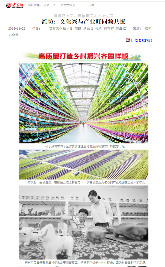 11月22日,农村大众报头版头条文章《潍坊:文化兴与产业旺同频共振》中报道姜庄镇在“开发研学线路、推动乡村风俗传统共促共进”的经验做法。