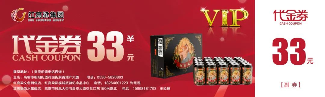 2.酒水代金券可就近到以下两个地点领取:(1)昌安大道与创业街交叉口东200米路南红高粱酒水旗舰店;(2)高密市东北乡文化发展区红高粱影视城。