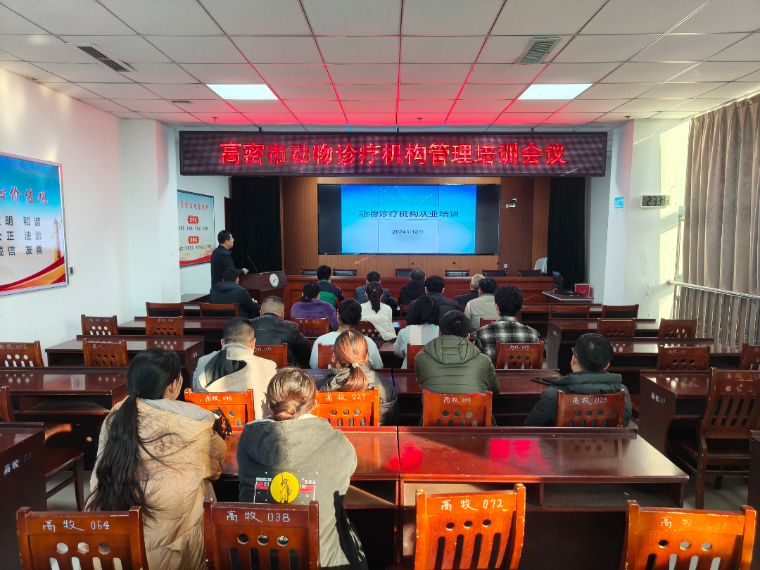 为进一步提升高密市动物诊疗机构规范化水平,推动动物诊疗行业健康有序发展,12月4日,市畜牧业发展中心组织召开2024年度动物诊疗机构管理培训会议,畜牧中心分管领导、兽医技术服务科全体人员、动物诊疗机构负责人及执业兽医师共计20余人参加了会议。