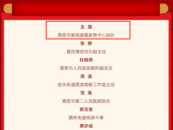 王熠,女,现任高密市星熠康复教育中心园长。她将青春奉献在她所热爱的特殊儿童康复、教育岗位,用无私大爱为特殊儿童撑起一片晴空,用真诚守护着“折翼天使”。她在儿童康复、教育岗位上坚守15年,创办高密市首家公办特殊教育福康幼儿园,解决特殊学龄前儿童入学难问题。此后又创办星熠康复教育中心(星熠家园)和高密星熠康复医疗中心,承担全市1000多名特殊青少年预防、早期干预、诊断、康复治疗、特殊教育及指导家庭训练任务。先后获得中国好人、新时代最美女性、山东省巾帼建功标兵、潍坊市“最美家庭”和潍坊市首届“文明家庭”等荣誉称号。