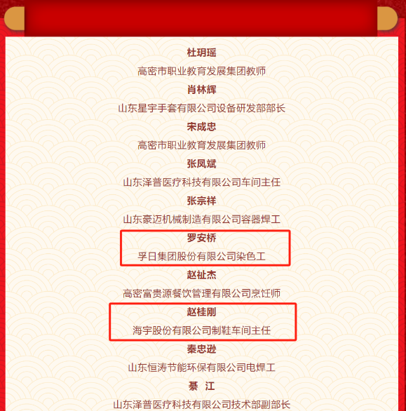 赵桂刚,男,现任海宇股份有限公司制鞋车间主任。入职以来,认真研究制鞋成型的每一道工序,琢磨出一套特色制鞋技术,拉帮和扣底是他的技术绝活。工作中,始终秉承“以师带徒、以匠带兵”的精神,在积极完成本职工作的同时,利用自己独特的“制鞋技术”,充分发挥工匠人才“传帮带”作用,先后培养优秀班组长12名,带领团队荣获2项发明专利,7项实用新型和外观专利,全部专利已进行科技成果转化,为企业带来近3000万元收入。