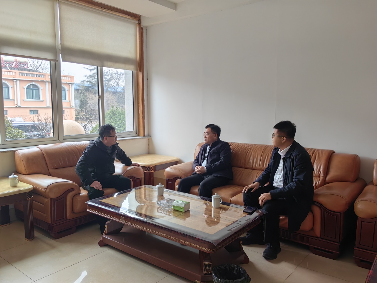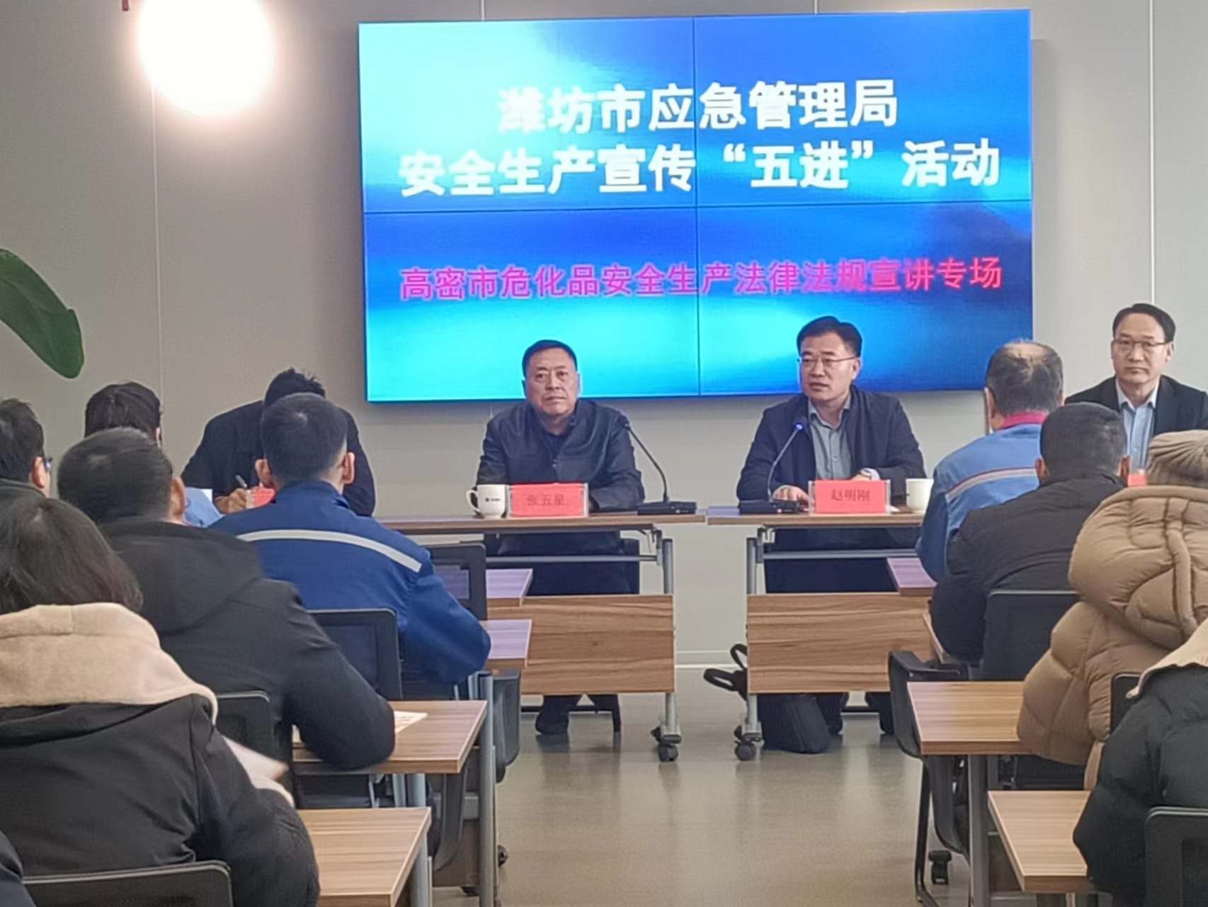 //市应急局党委书记、局长赵明刚与裕达油脂主要负责人座谈交流(左);联合潍坊市局推进安全宣传“五进”(右)//