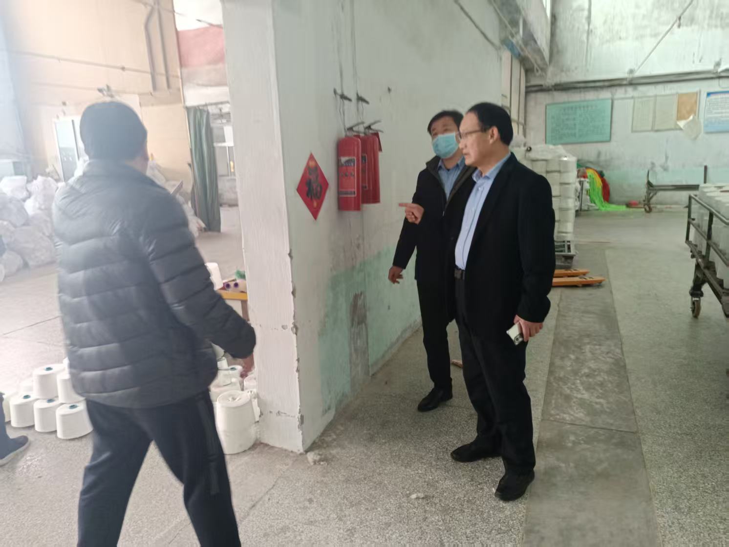 //四级调研员宋学军当场指出振华纺织隐患问题并要求做好整改(左);四级主任科员王志鹏详细了解泰顺纺织安全措施落实情况(右)。//