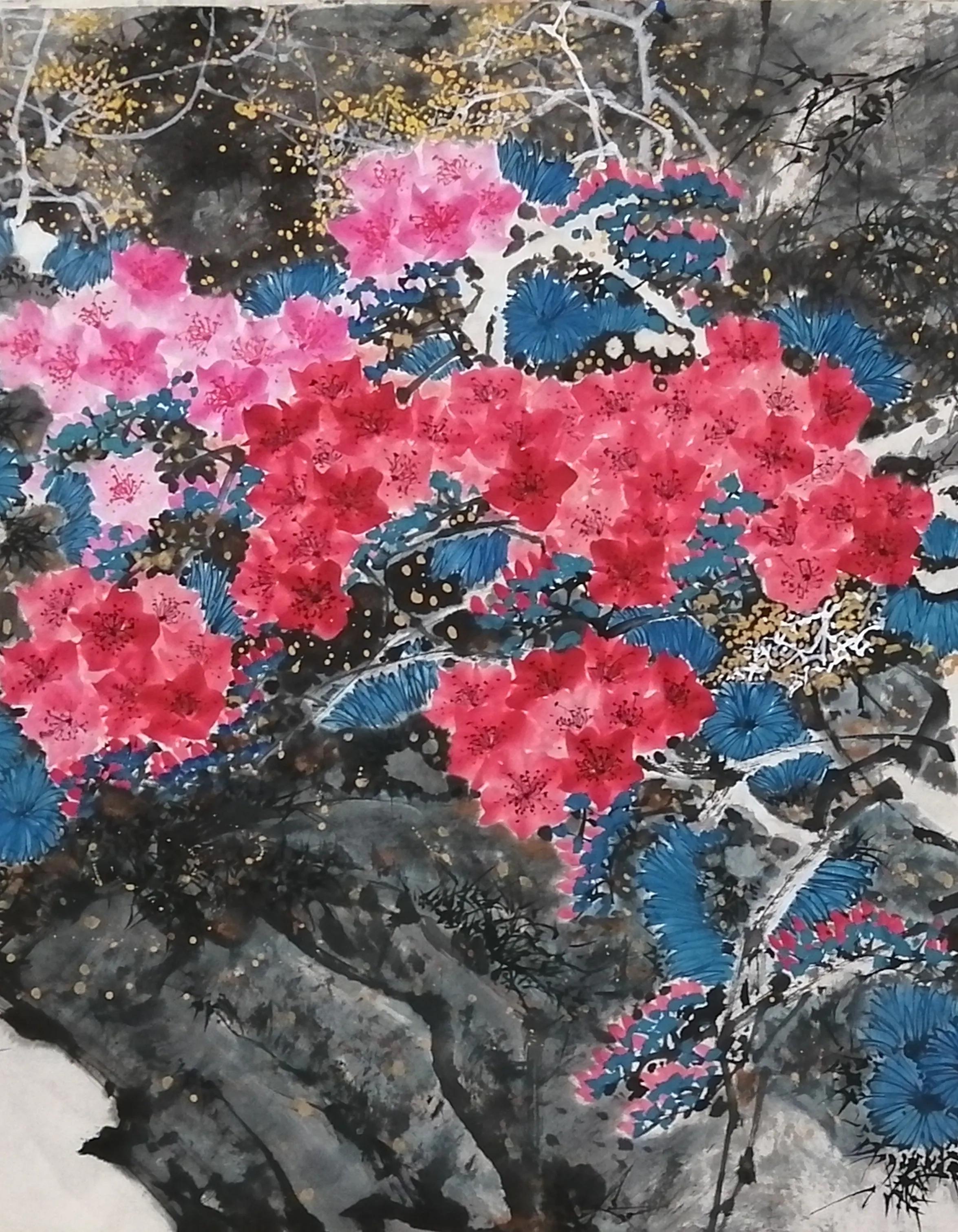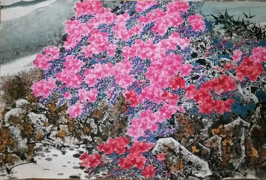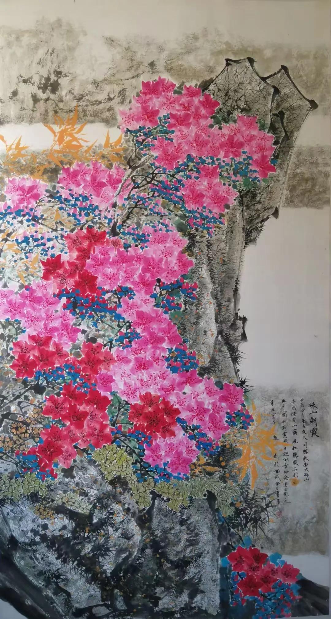 前行数里,古径曲折,鸡犬相闻,路行六七人,问之则曰:毛家河,吾等寻映山红而去,及至山腰,此花成片,可谓:不待山中一夜雨,自有朝霞映碧天,以筆记之。