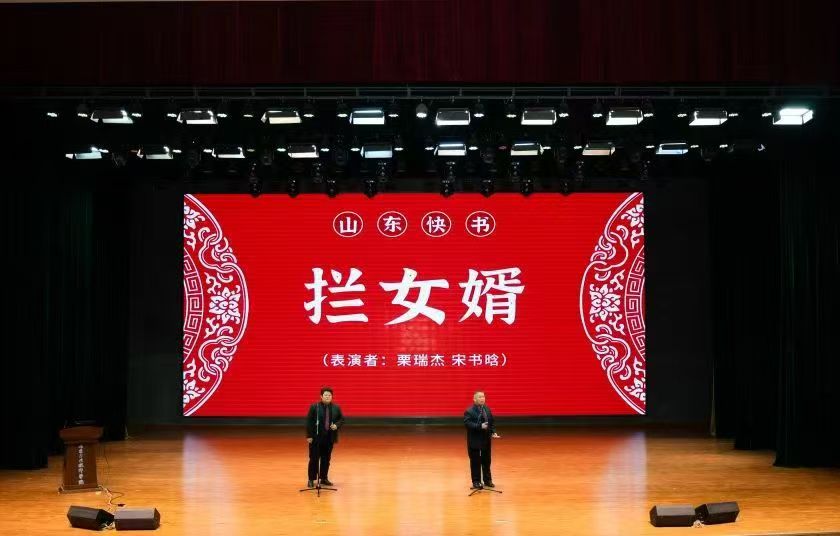 4月10日—11日,潍坊市委宣传部、市委教育工委联合举办潍坊市“学思想 悟道理 用方法”主题宣讲进高校活动,我市民乐曲艺团栗瑞杰、宋书晗作为宣讲团成员走进潍坊学院、山东工业技师学院、潍坊职业学院进行山东快书《拦女婿》宣讲。