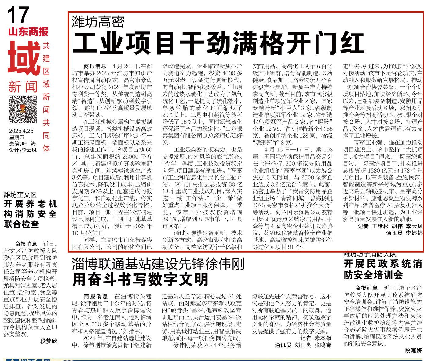 4月份,在新华社、人民网、经济日报、科技日报等潍坊市级以上主流媒体刊发外宣稿件100余篇,其中,中央级媒体17篇,头版4篇。4月7日,科技日报07版刊发《山东高密:“三向奔赴”促成果落地开花》,报道我市校地企合作亮点做法;4月24日,农民日报08版整版刊发移风易俗深度访谈——《“移”出新风尚,“易”出好生活》,我市市委常委、宣传部部长代辉接受采访,介绍我市移风易俗工作;《山东高密:“花样”文旅激活春日经济》《山东高密:以存量变革拉长优势产业长版》《山东高密:全链服务护航民营经济腾飞》等反映工业经济、服务企业、项目建设、文旅经济稿件在新华财经、新华网等中央级媒体刊发;策划皮革大会、校地合作大会、劳保展以及智能制造、医药健康产业集群等重点稿件,第一时间在经济日报、山东商报等媒体刊发稿件25篇,形成阶段性宣传高潮;《高密:医药健康产业集群正在崛起》《劳保用品拓宽市场》等稿件在《潍坊日报》头版刊发;5篇稿件被潍坊市《网上舆情快报》收录采用。
