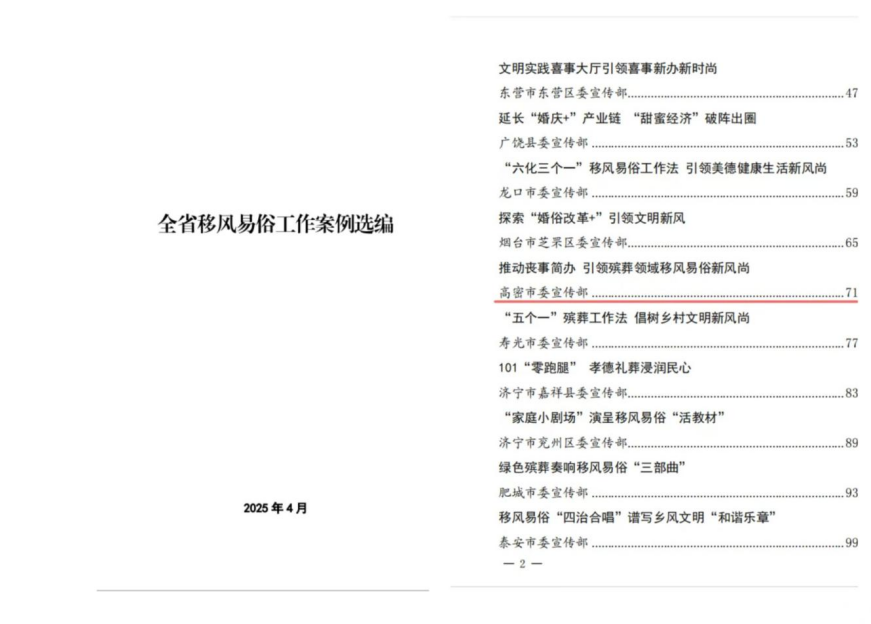 近日,山东省委宣传部发布《全省移风易俗工作案例选编》,我市《推动丧事简办 引领殡葬领域移风易俗新风尚》案例入选。