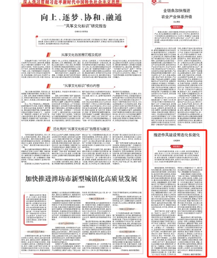 4月12日,潍坊日报理论版刊发我市市委党校管遵华署名文章《发展家庭农场 助力乡村振兴》;4月26日,潍坊日报理论版刊发我市市委党校毛新玲署名文章《推进作风建设常态化长效化》。