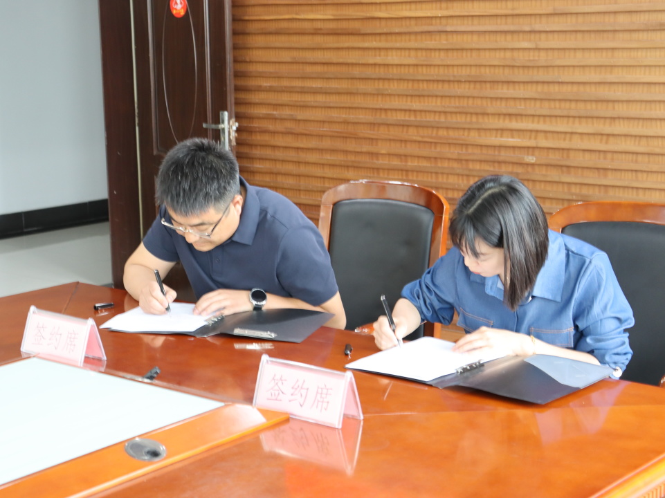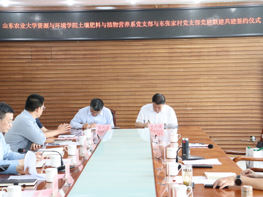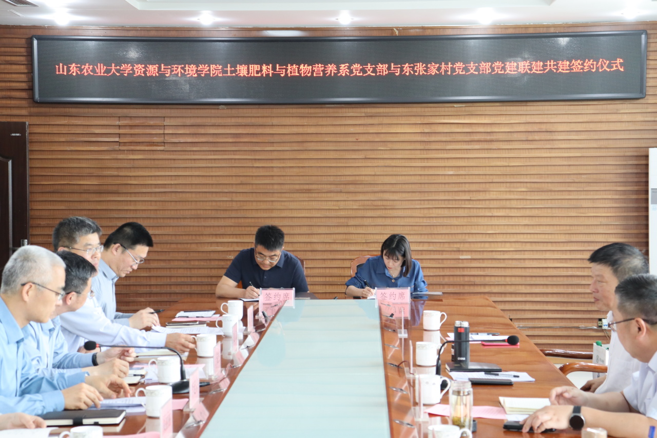 ▲山东农业大学资源与环境学院团委书记刘然与夏庄镇东张家村党支部书记、村委会主任张林签订《党建联建共建协议书》。