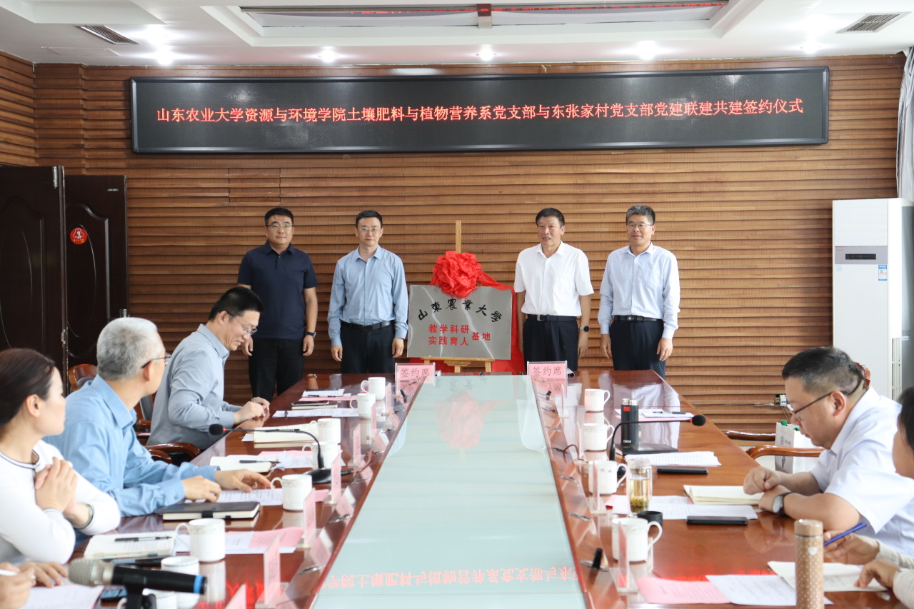 ▲山东农业大学资源与环境学院党委书记郑峰,高密市委组织部副部长于俊杰为高密市胶河农场、夏庄镇东张家村“教学科研实践育人基地”揭牌。
