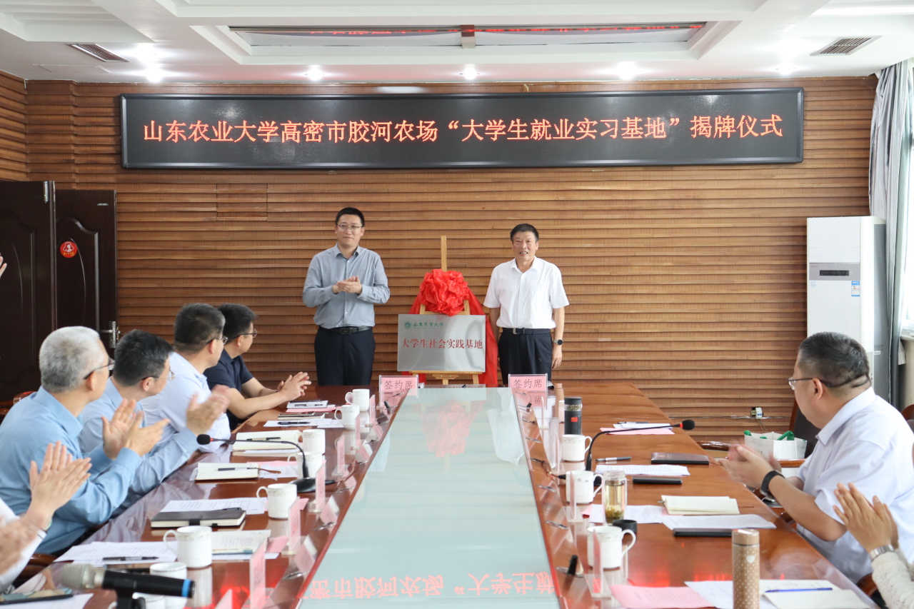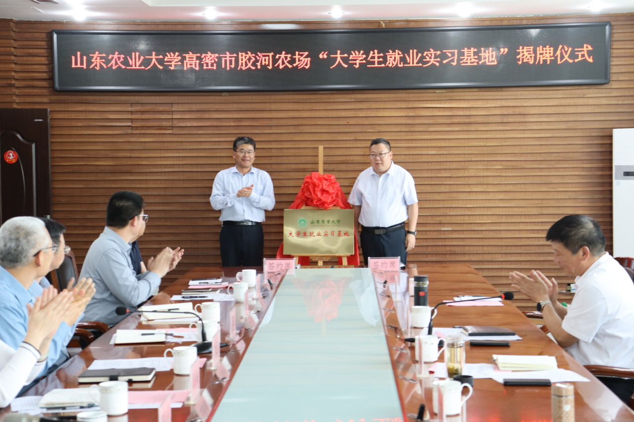 ▲山东农业大学资源与环境学院副院长娄燕宏,高密市胶河农场党委书记、场长栗磊为高密市胶河农场“大学生就业实习基地”揭牌。