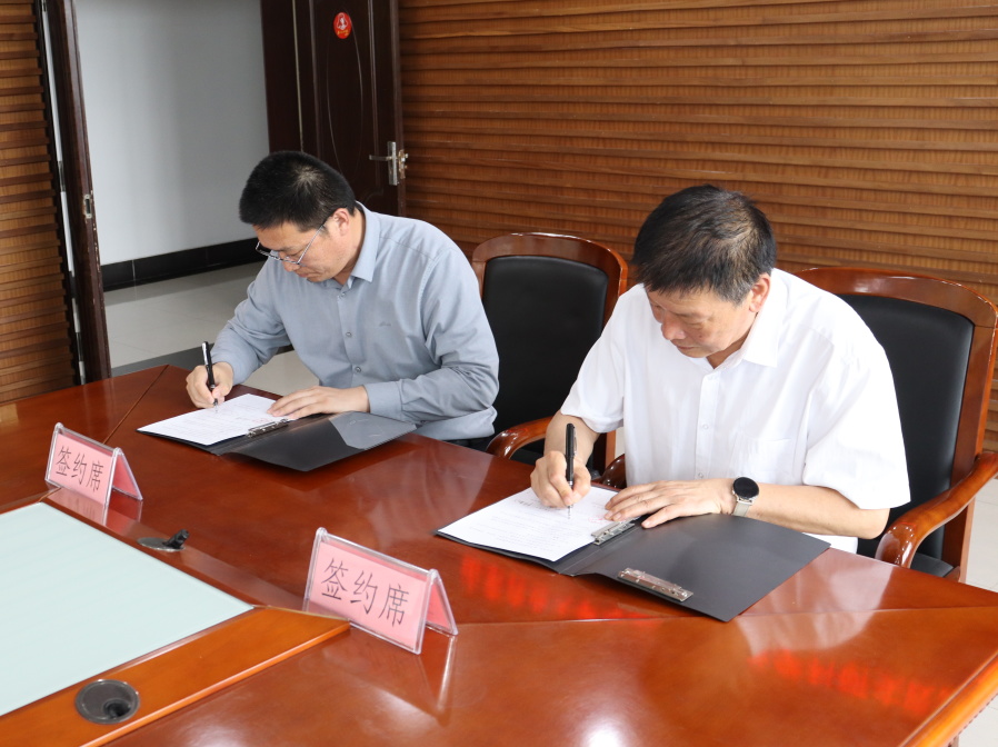 ▲山东农业大学资源与环境学院党委书记郑峰与高密市农业农村局党组成员、市胶河农场党委书记、场长栗磊签订院地合作协议。