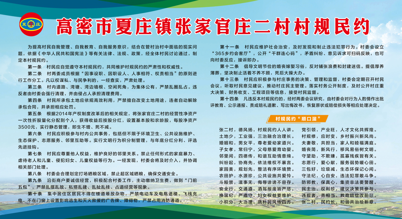 张家官庄二村位于高密市城区北部,共235户,900人,党员37人,总土地面积1300余亩,其中,耕地265亩。近年来,该村在党建引领下,探索出一条“工业反哺农业、三产融合发展”的强村富民之路,成为业态集聚、要素齐全、服务完备的城镇化集中居住社区,全村90%的劳动力从事二三产业,90%的收入来源二三产业,2024年实现集体经济收入700万元。先后荣获“全国民主法治示范村”“全国妇联基层组织建设示范社”“全国五四红旗团支部”等称号。