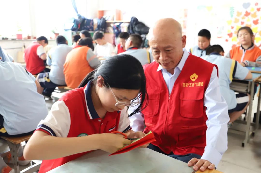 活动现场,“五老”志愿者董双强就剪纸作为非物质文化遗产进行科普,讲述剪纸艺术的历史脉络与文化价值。接着和老师一起动手示范,教授学生们亲自进行剪纸操作,以剪代笔、纸上生花。