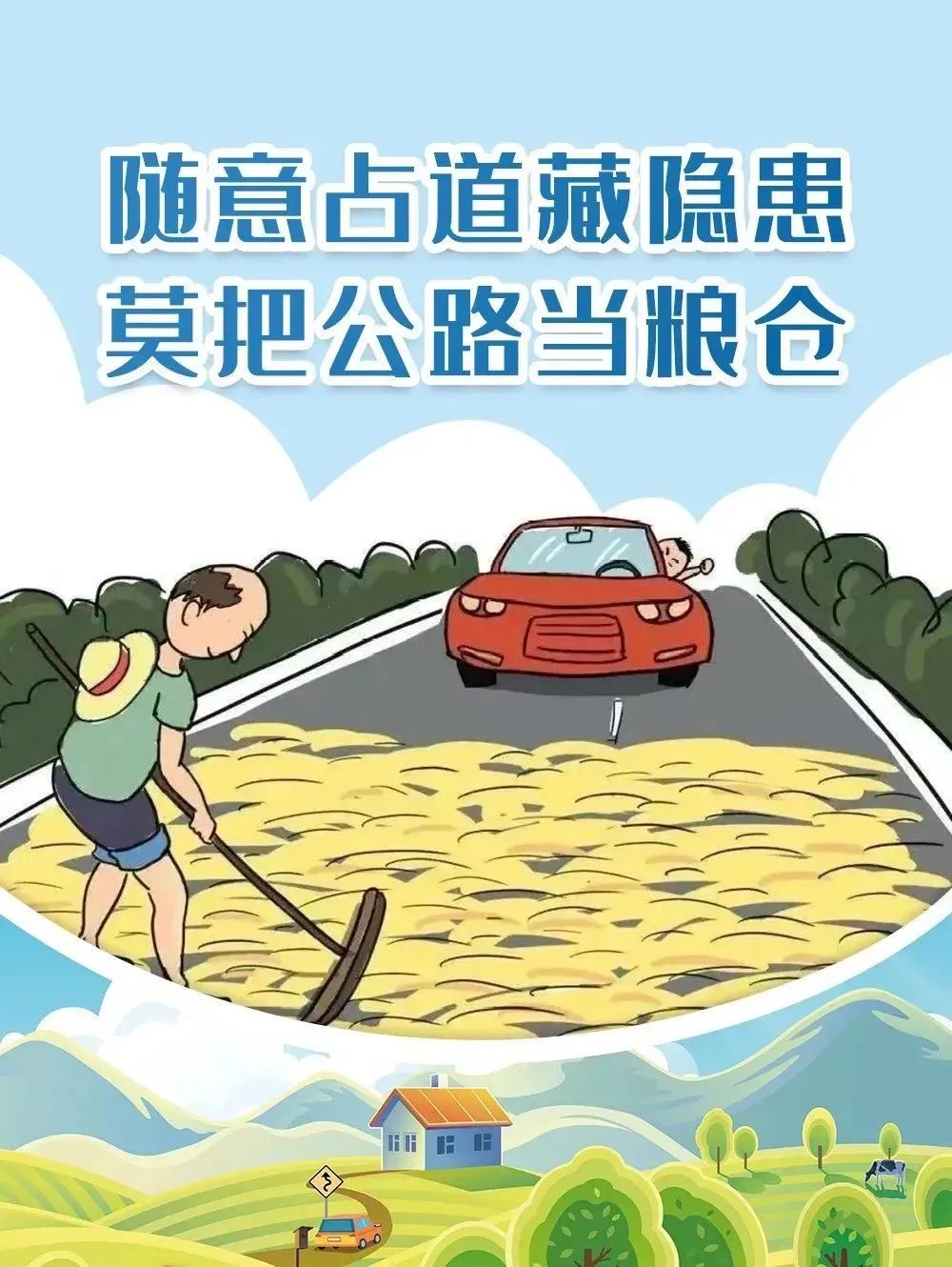 农民朋友们,为了您和他人的生命财产安全,请拒绝“公路打场晒粮”。让我们携手共同创建一条“畅、安、 舒、美、洁”的致富之路、文明之路。