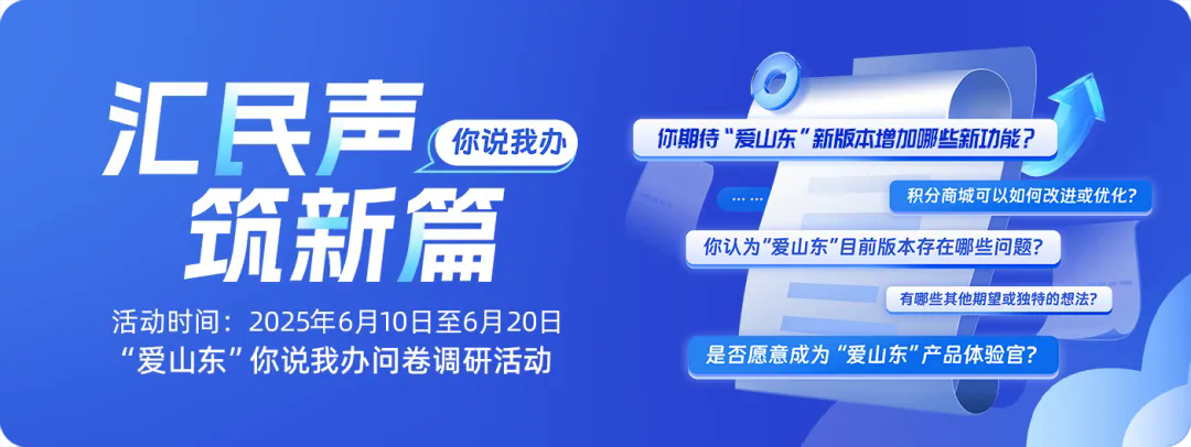 本次活动将持续至2025年6月20日,您可通过“爱山东”三端参与问卷调查。期待您的宝贵意见!