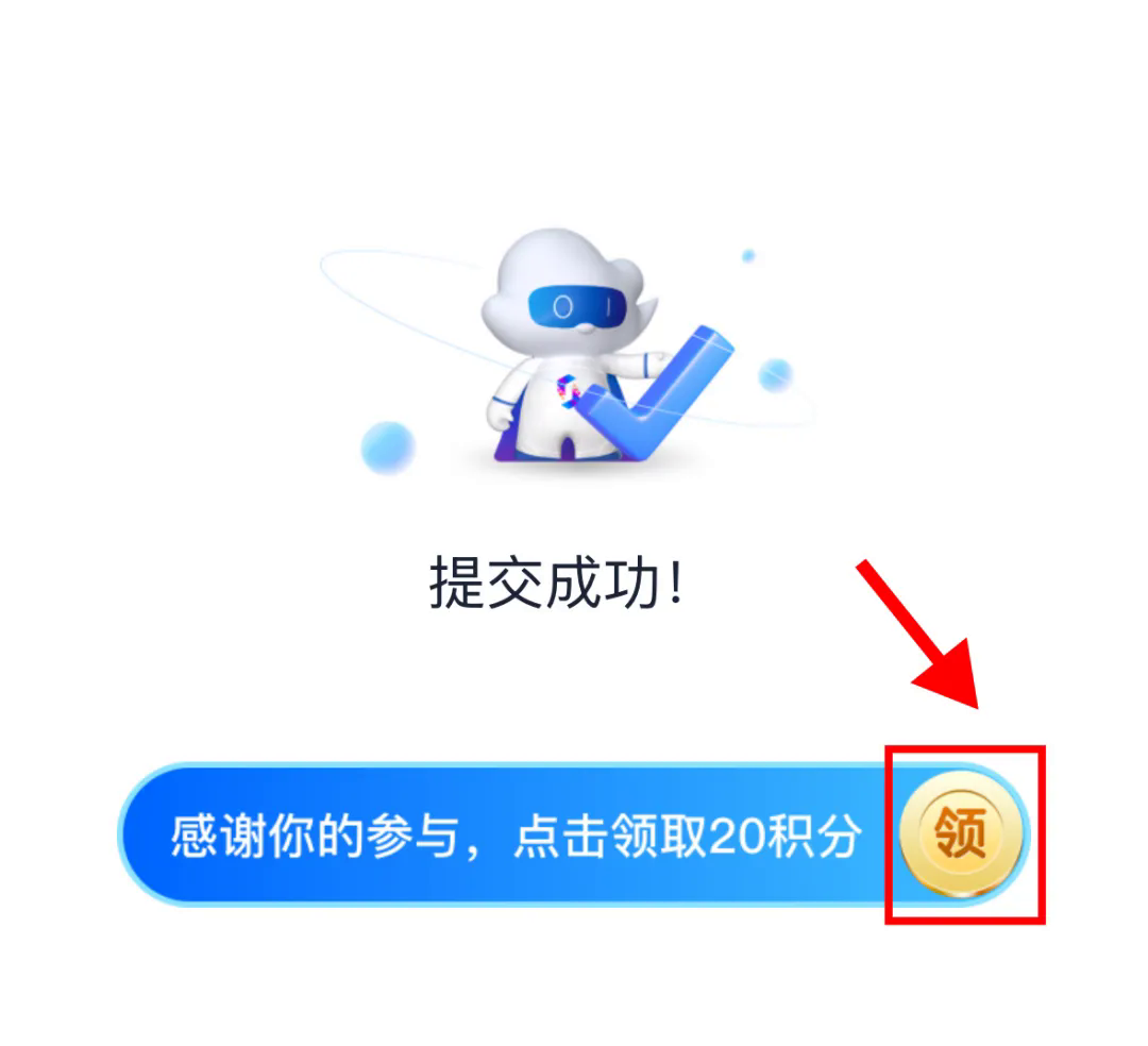 问卷填写完成,需选择所在地区,点击“提交”按钮。待提交成功跳转至领取积分页面时,点击“领”字,即可获取“爱山东”20积分。