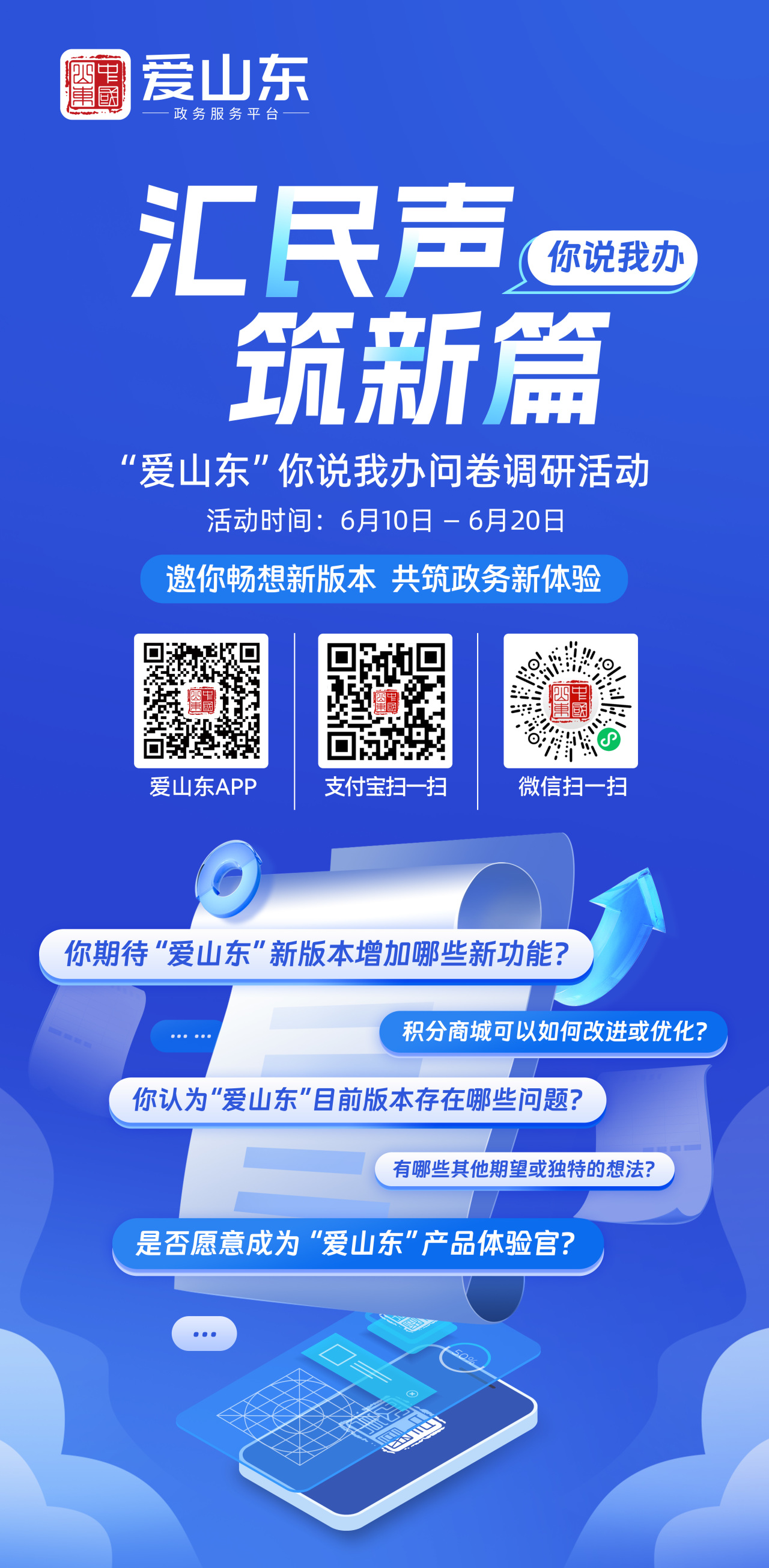 2025年6月10日,“爱山东”政务服务平台“你说我办”问卷调研活动正式启动。本次活动以“汇民声·筑新篇”为主题,旨在全面了解广大用户对“爱山东”新版本的需求和期待,全面提升平台服务质量和使用体验。