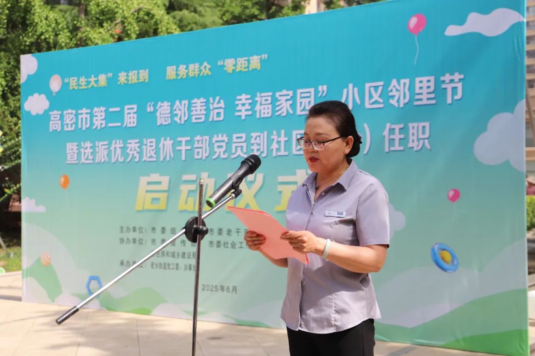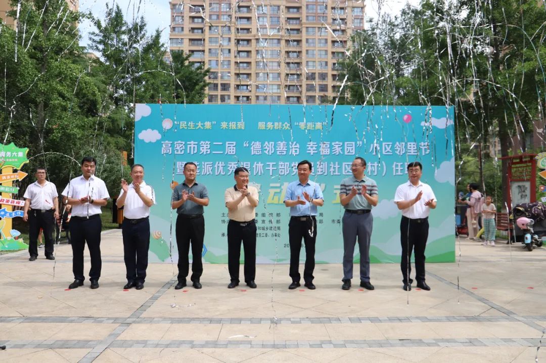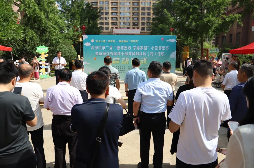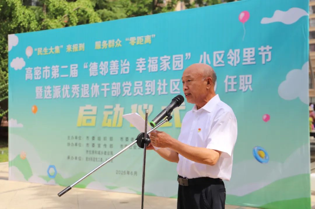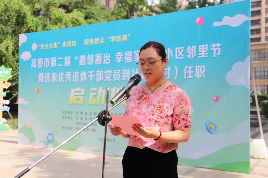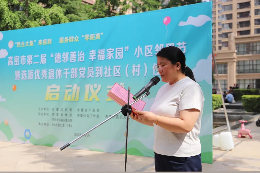 为加强党建引领基层治理,弘扬邻里团结、互助和睦的传统美德,建设安定祥和、温馨和谐的幸福家园,6月21日,高密市第二届“德邻善治 幸福家园”小区邻里节暨选派优秀退休干部党员到社区(村)任职启动仪式在密水街道湖光金色小区举行。市委宣传部分管日常工作的副部长、市网信办主任薛永文,市委社会工作部部长、“两新”工委书记李彬,市委市直机关工委书记牟林,市委组织部副部长、老干部局局长张武伟,市委组织部副部长唐召康出席活动,密水街道党工委副书记、办事处主任东辉主持。湖光金色小区党支部书记陈晓,“双报到”单位代表市司法局,物业经理代表荆海燕,派驻社区“第一书记”代表禚召聪,外卖骑手代表杨建富依次发言,表示坚持党建引领基层治理,积极参与小区活动,全力营造和谐友善的邻里氛围,共同打造幸福家园。